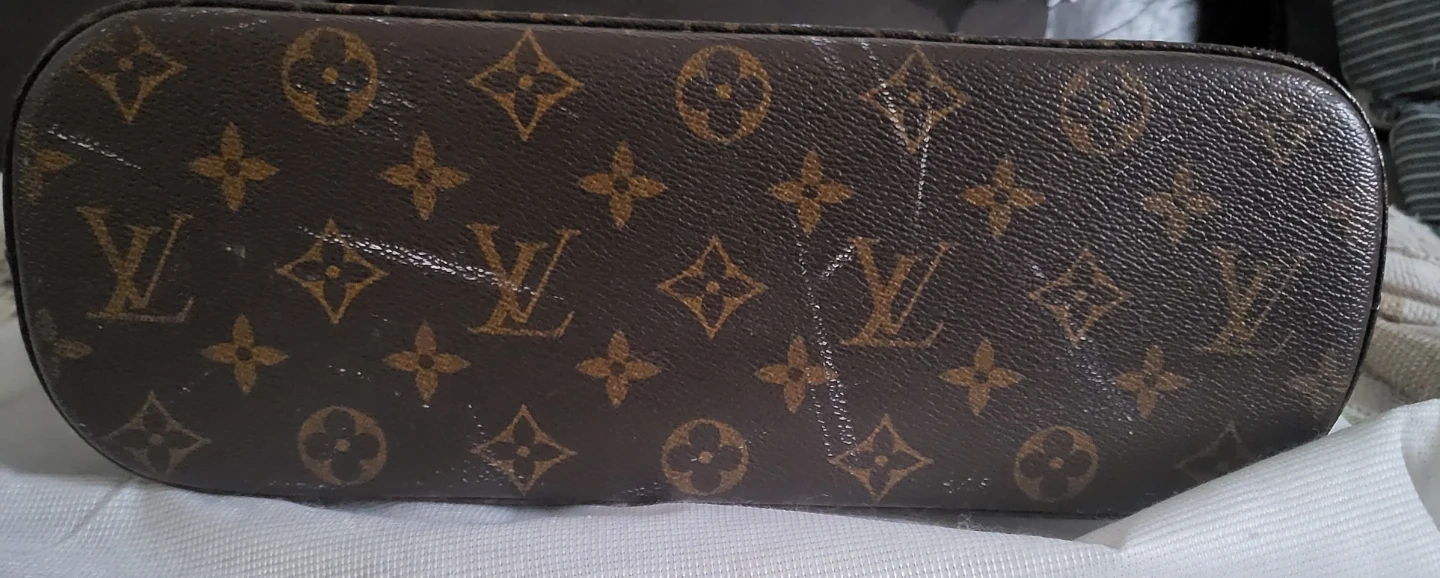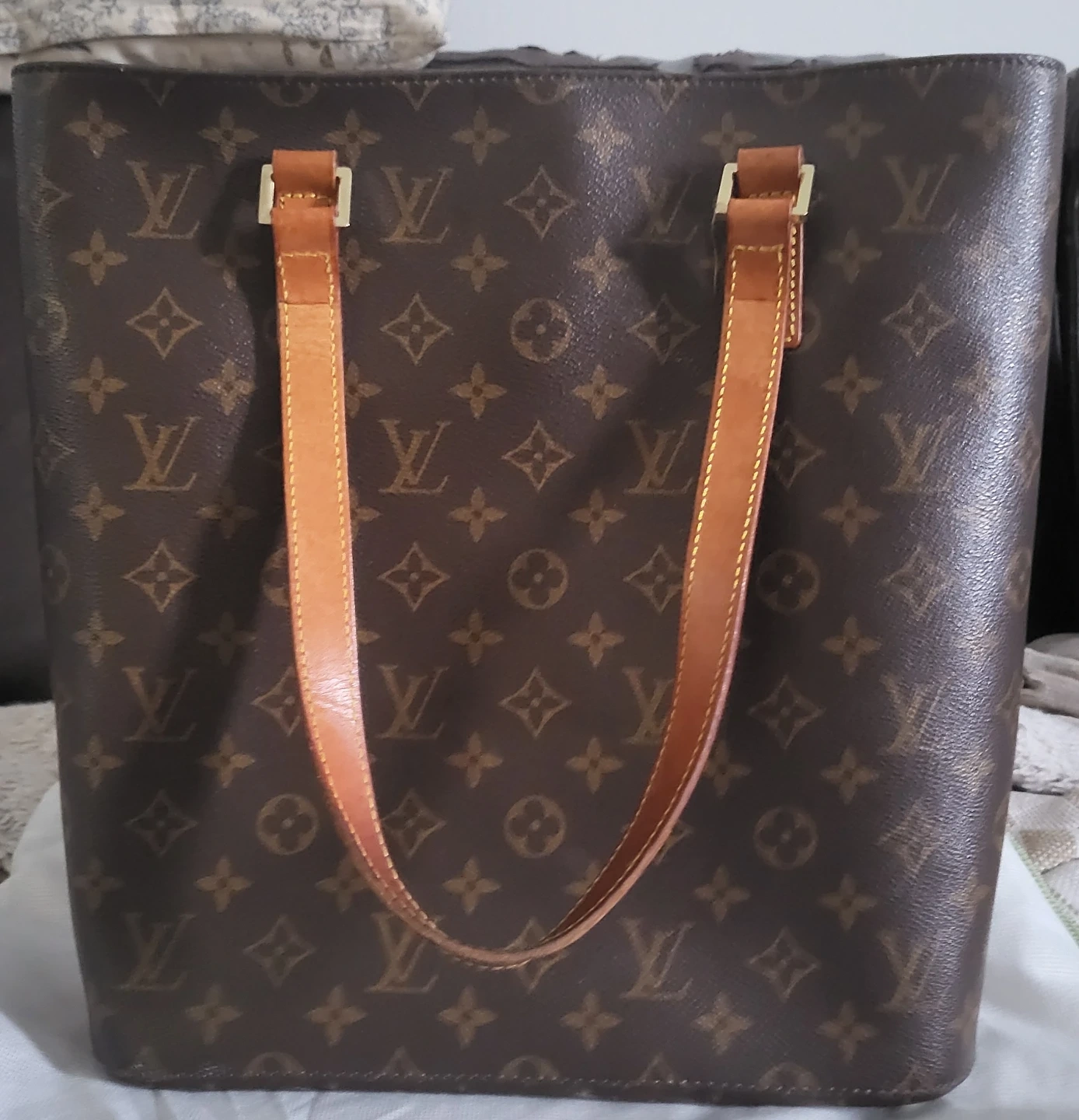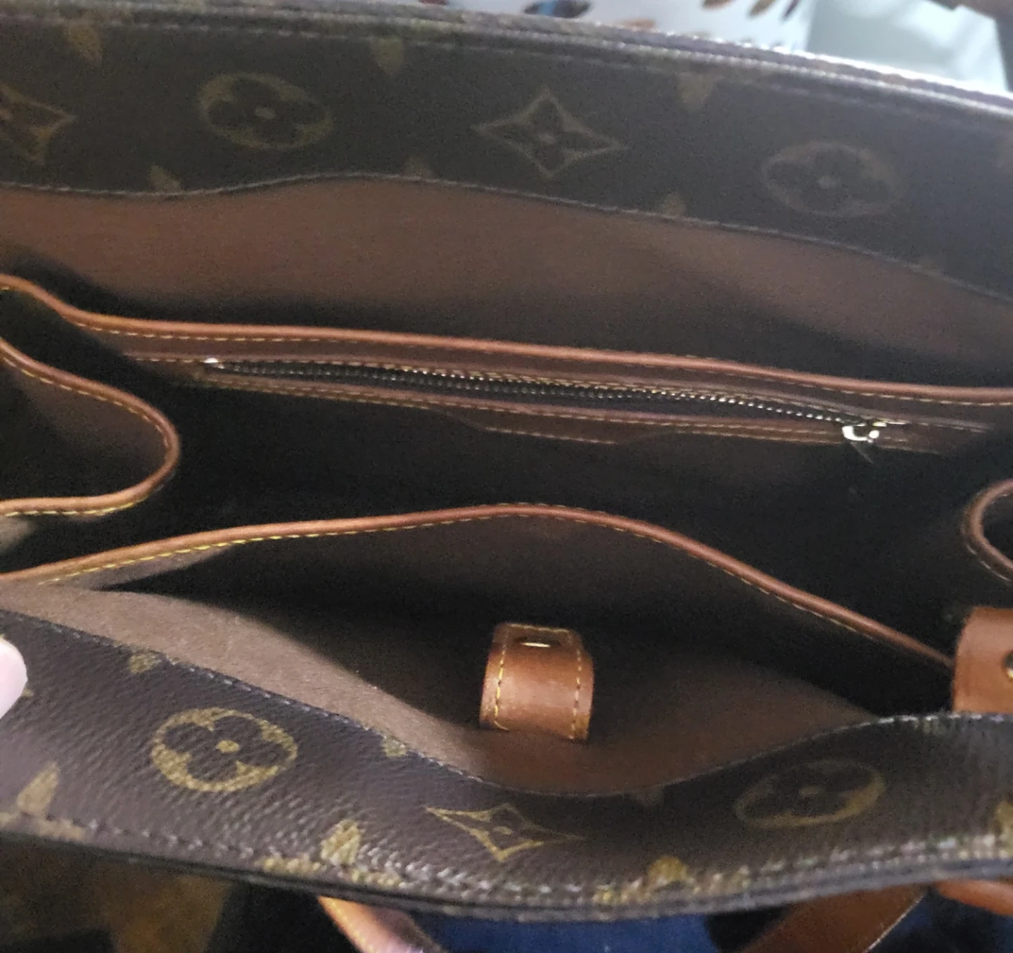 Classic Louis Vuitton tote bag in monogram canvas. It features leather handles and trim. Interior has multiple compartments, including a zippered pocket. This bag is perfect for everyday use or travel.