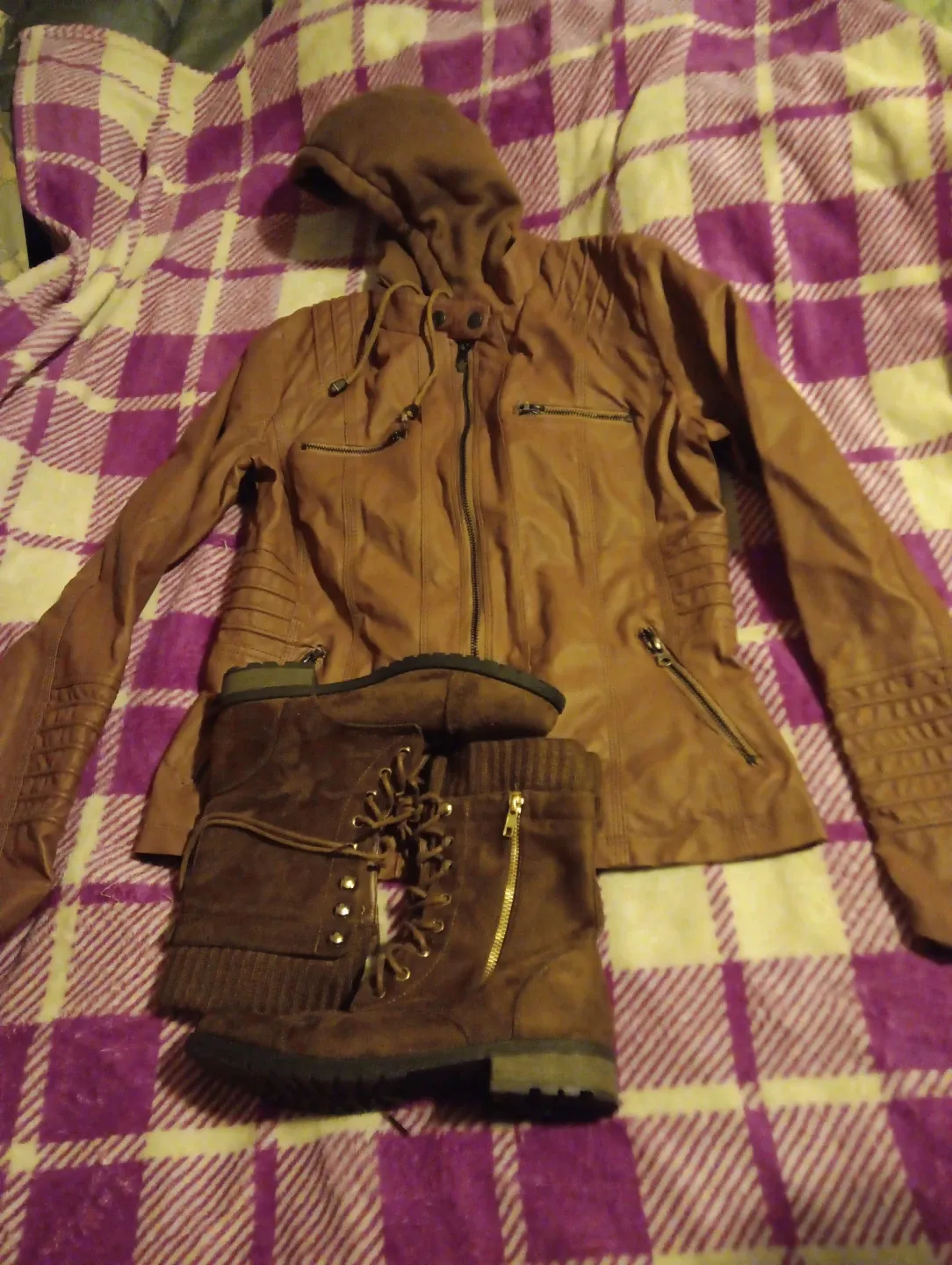 Brown faux leather jacket with a hood and zippered pockets. Paired with brown suede-like lace-up boots featuring side zippers. This outfit combo is great for a casual, edgy look.