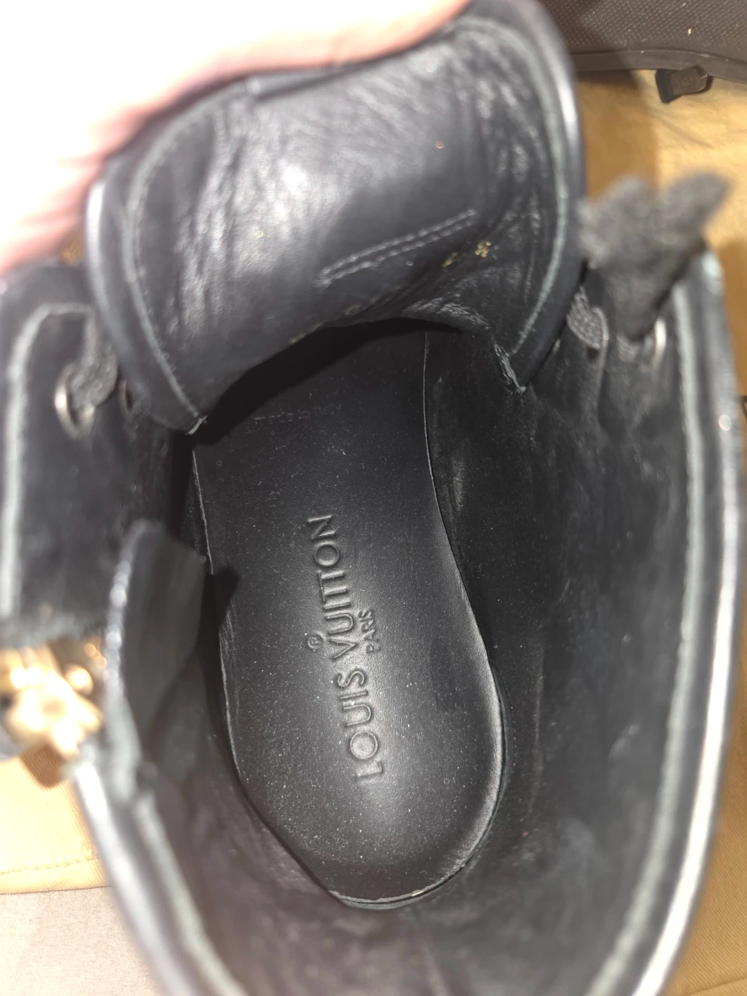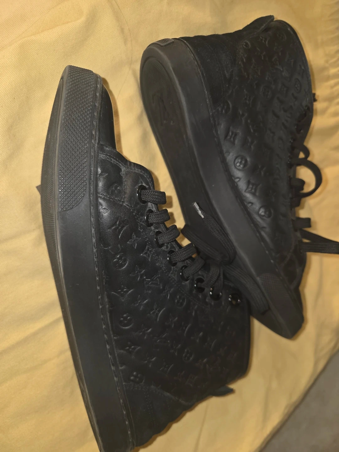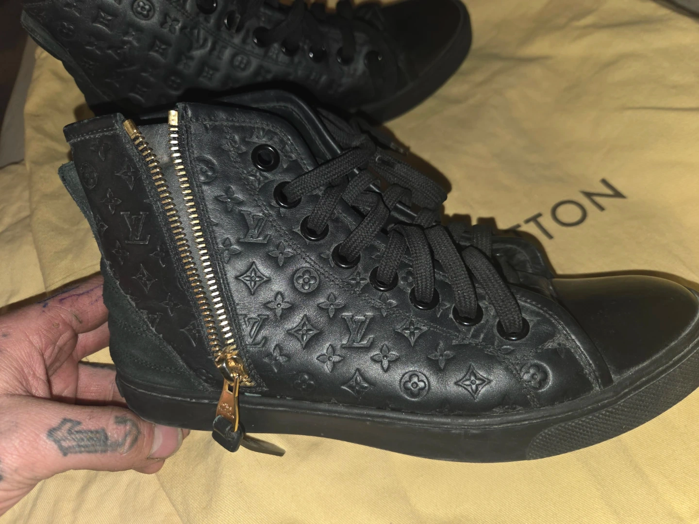 Selling a pair of Louis Vuitton high-top sneakers in black leather. These stylish sneakers feature the iconic LV monogram pattern throughout. They have a lace-up closure with a side zipper for easy wear. Great for adding a touch of luxury to your everyday look!