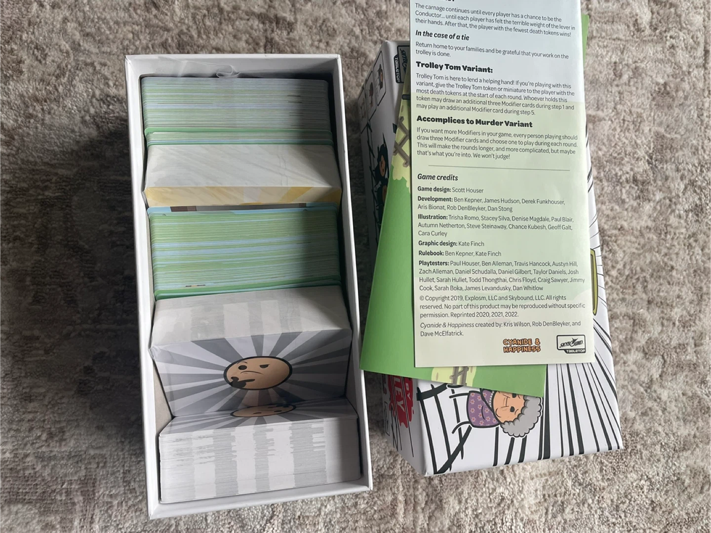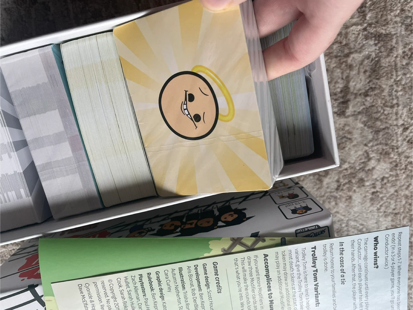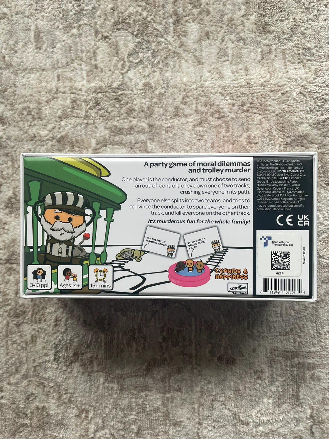 A party game of moral dilemmas and trolley murder. It's for 3-13 players, ages 14+, and takes 15+ minutes to play. This game is sure to spark some hilarious conversations!