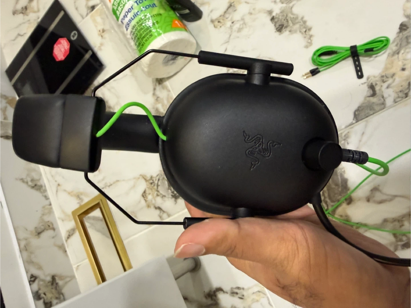 Razer BlackShark V2 X gaming headset β bought just 2 weeks ago, basically brand new. Only opened and tried once. Comes with the green braided cable and detachable mic. Sounds incredible β crystal clear audio and mic quality.