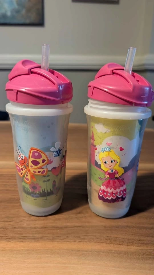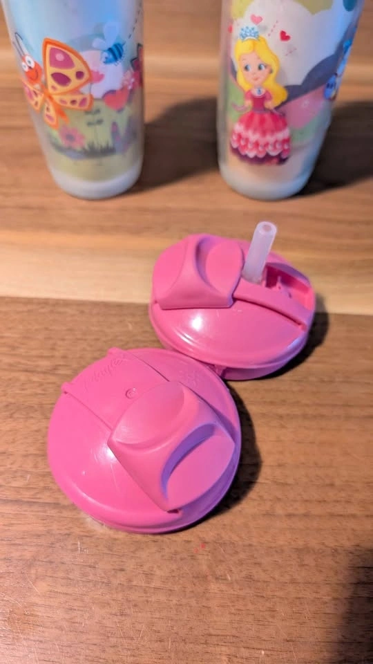 -x2 Playtex pink straw water bottles. Spill proof slide lid.