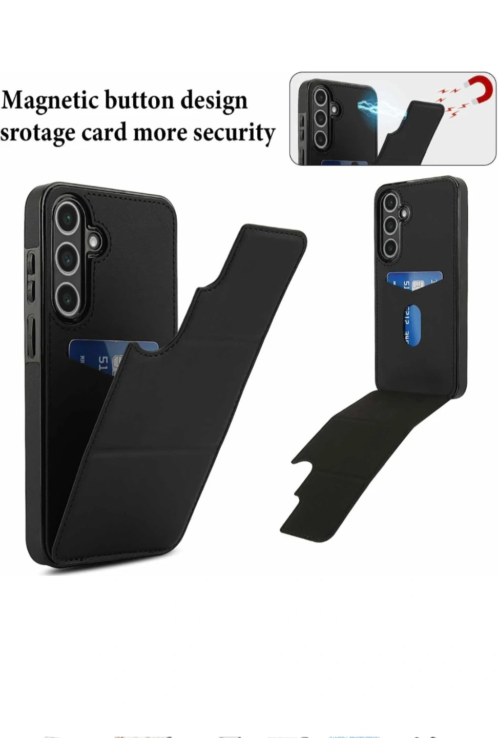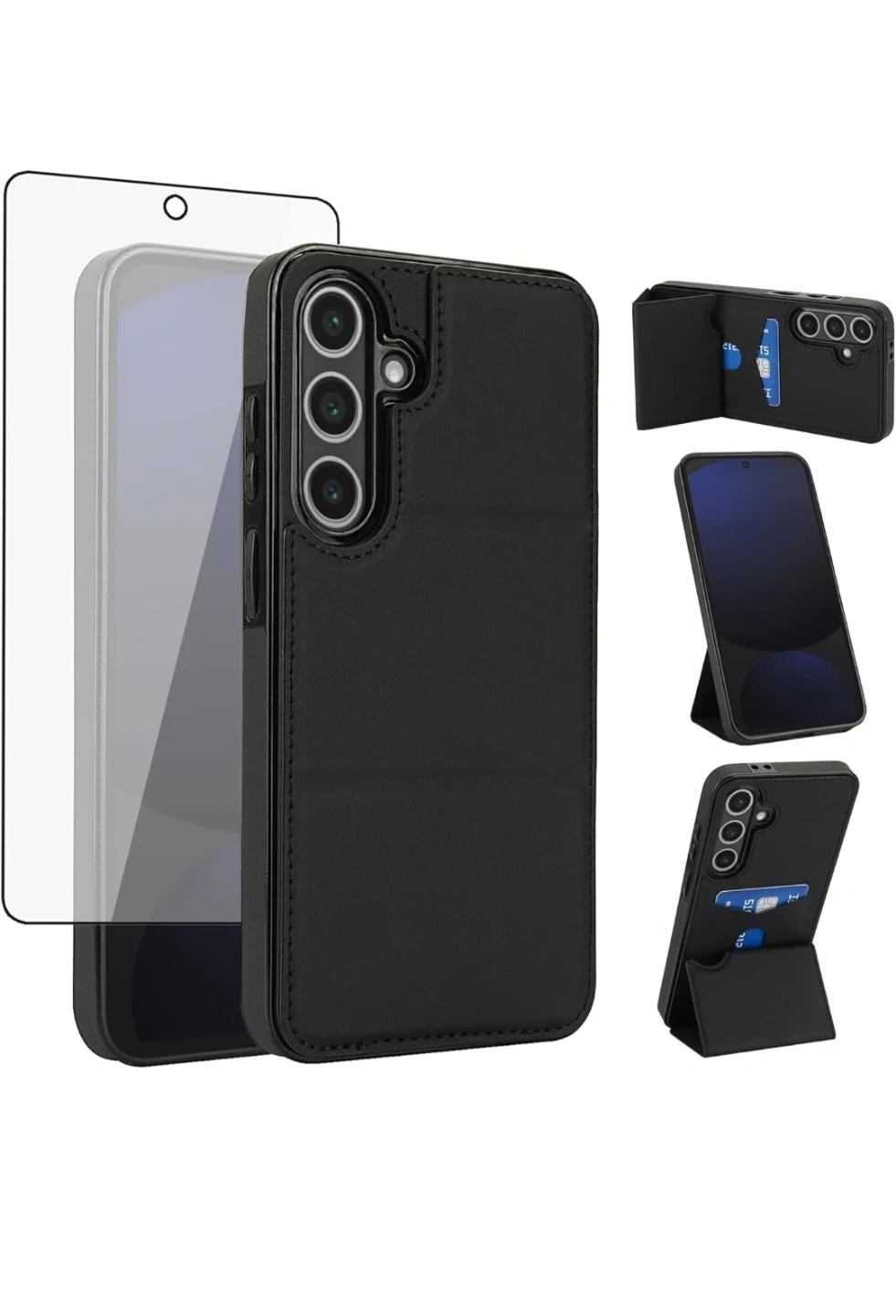 This is a black wallet case for a Samsung Galaxy S24FE. It has a magnetic button design and storage for cards for more security. It also comes with a screen protector
