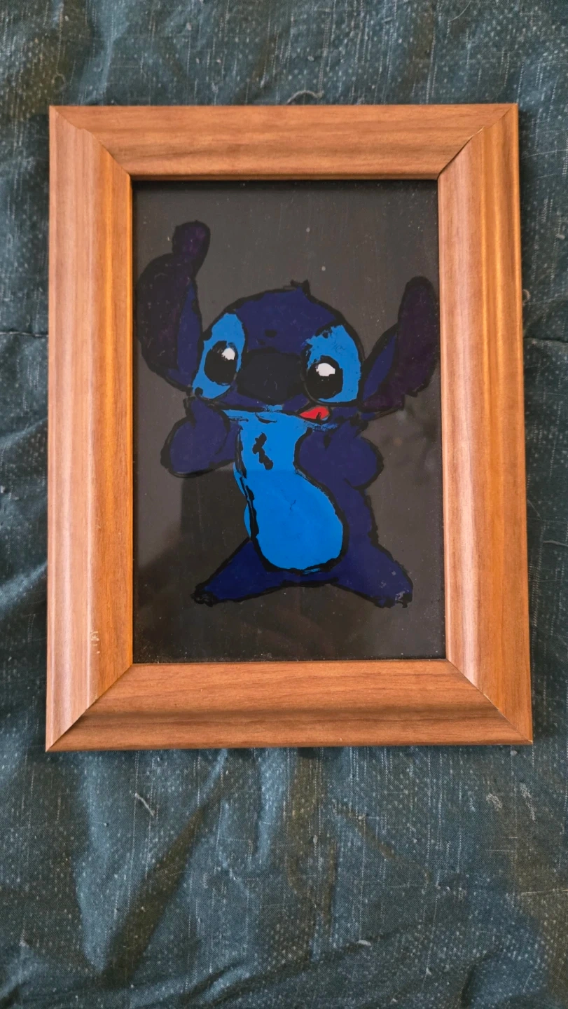 Hand-painted Stitch artwork in a wooden frame. This piece features the beloved character in vibrant blue and black colours. It's perfect for a Disney fan's collection!