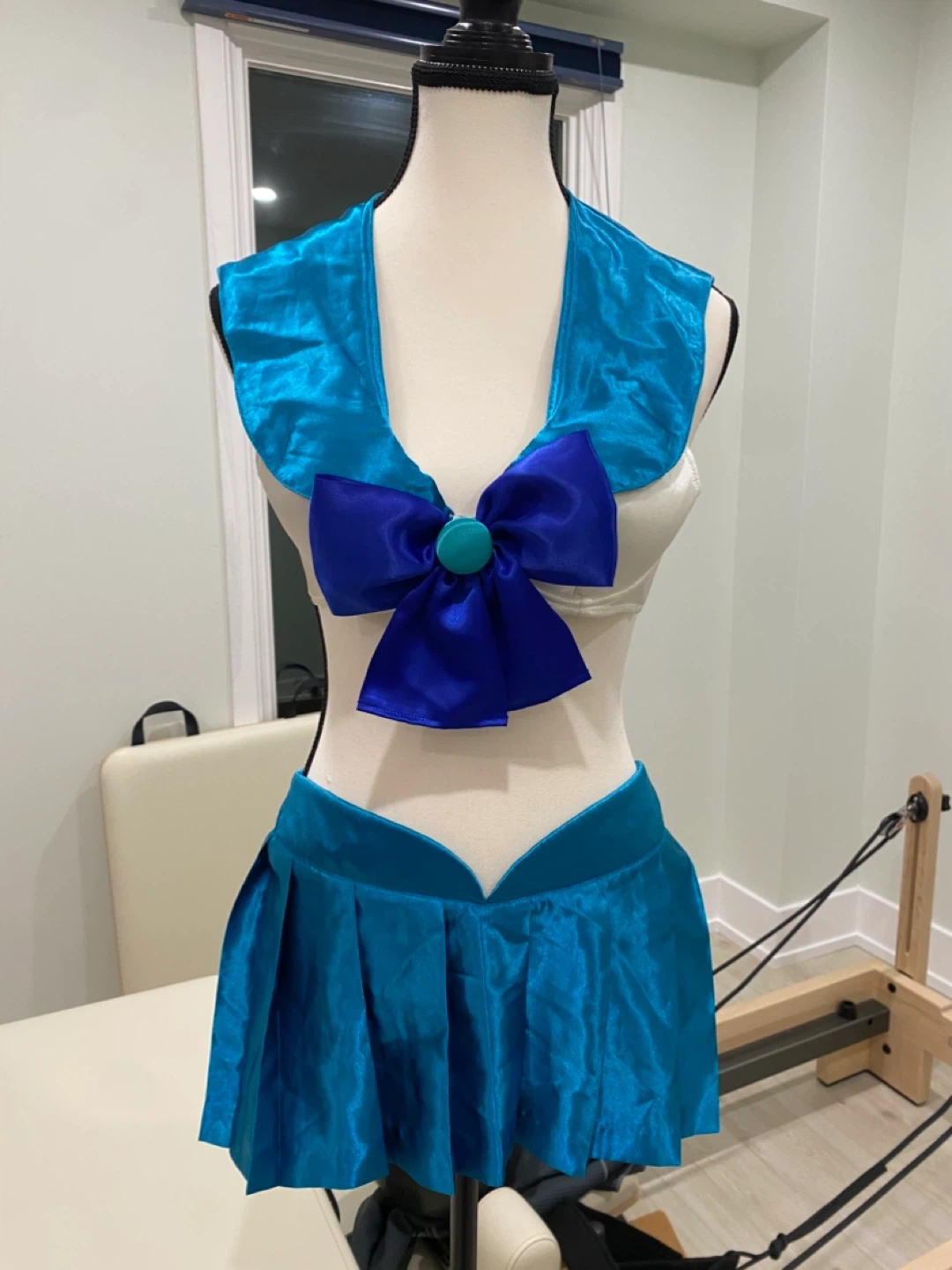 This vibrant blue sailor-style costume set includes a pleated skirt and a matching top with a large bow. It's a fun outfit for themed events. The fabric has a satin sheen.