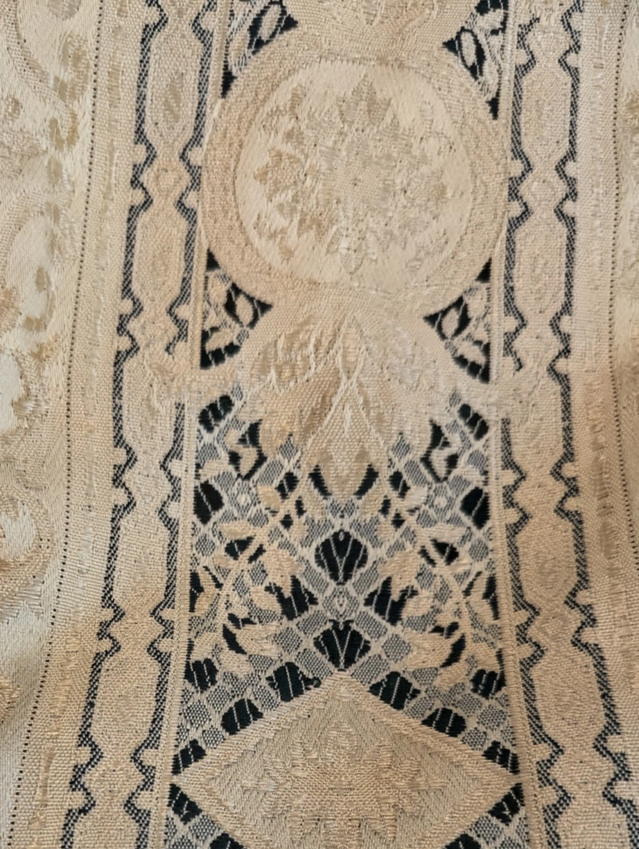 Set of four Sik cream-coloured curtains featuring a damask pattern with blue accents. These curtains are made of a textured fabric, polyester blend, and are designed with pleats at the top for hanging. They'll add a touch of elegance to any room!