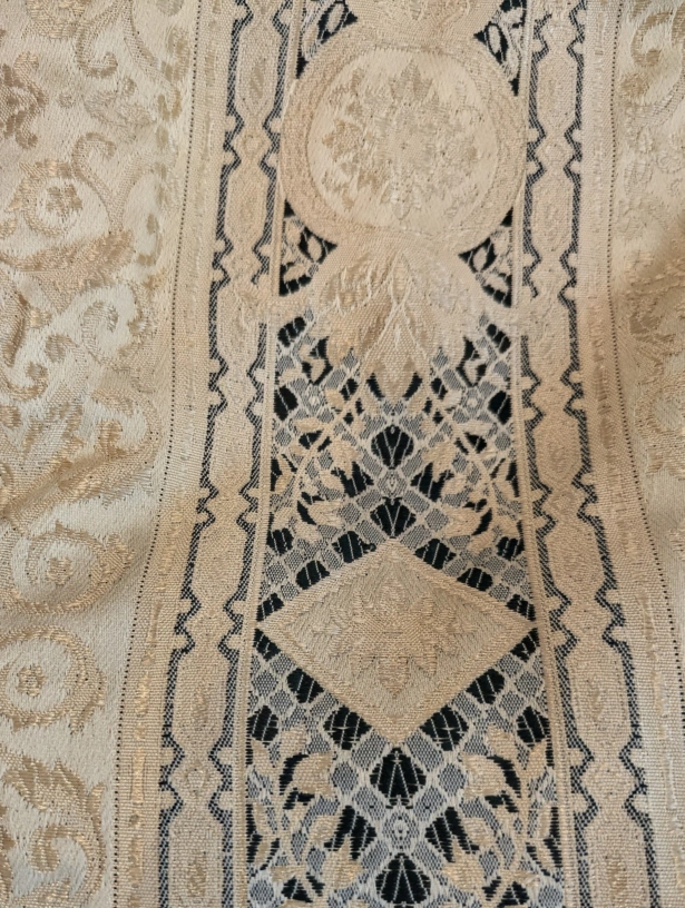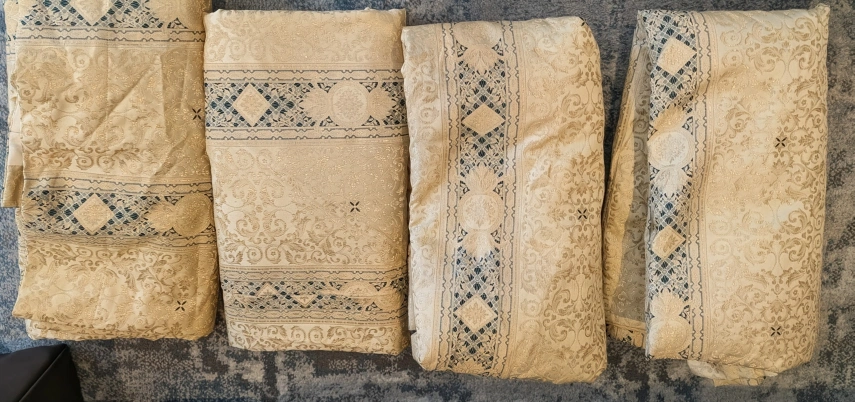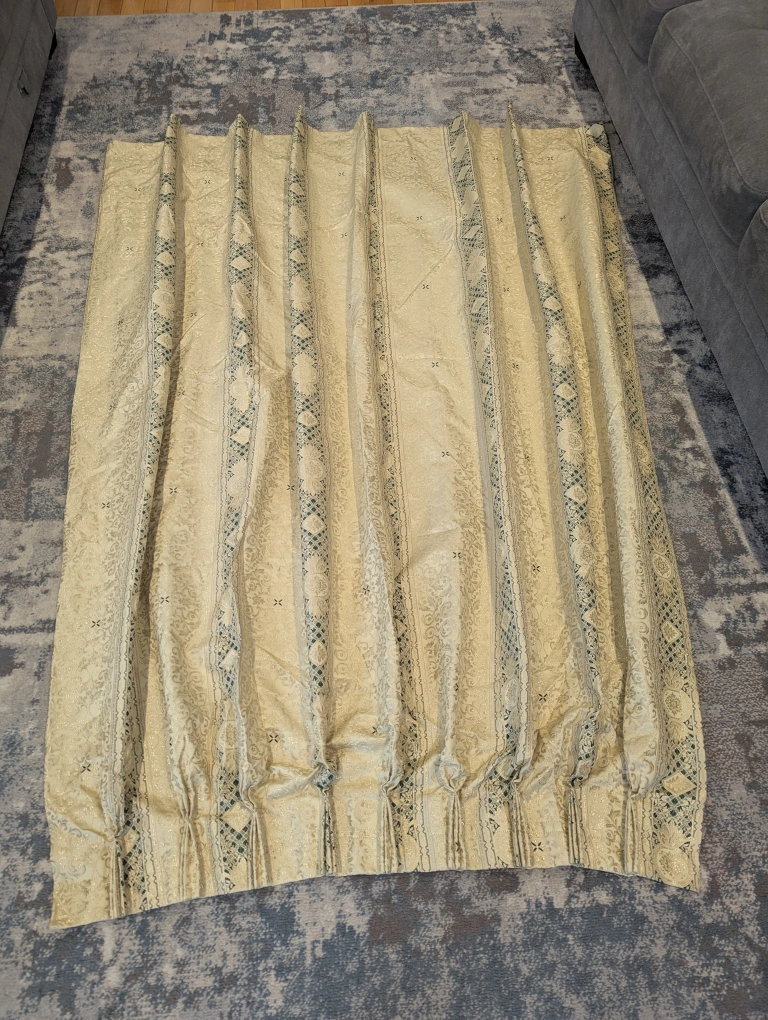 Set of four Sik cream-coloured curtains featuring a damask pattern with blue accents. These curtains are made of a textured fabric, polyester blend, and are designed with pleats at the top for hanging. They'll add a touch of elegance to any room!