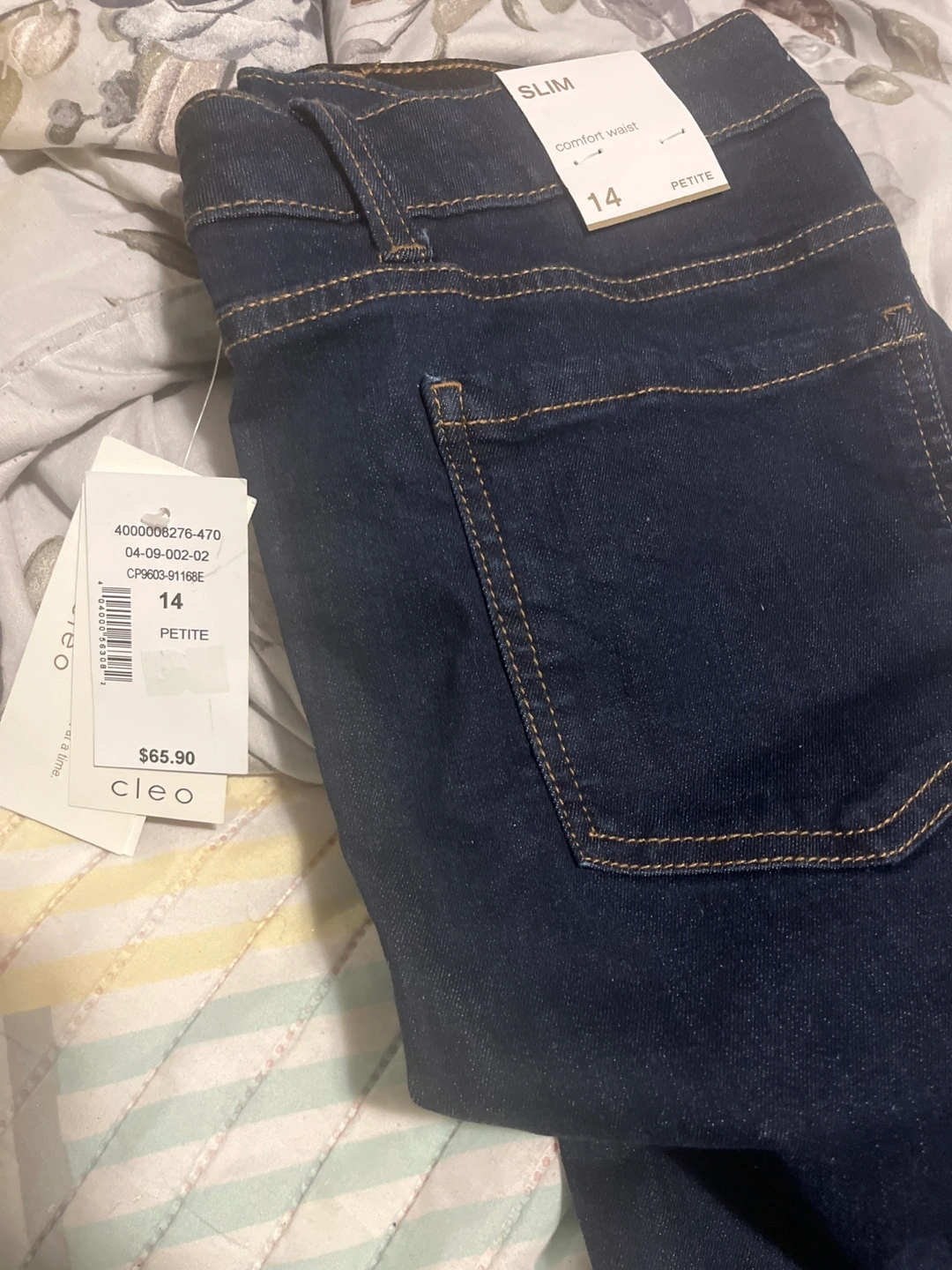 Selling a pair of Cleo jeans in size 14 Petite! They're a slim fit and have a comfort waist. The tag shows they were originally $65.90. They appear to be in great condition!