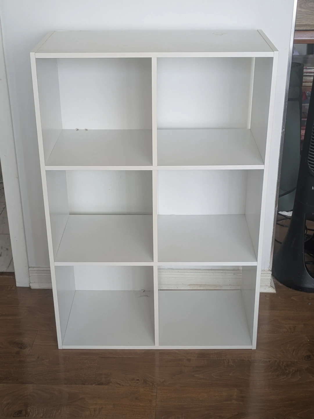 This white storage shelf has six cubes. It's a handy unit for organizing books or display items. Great for a den or child's room!
