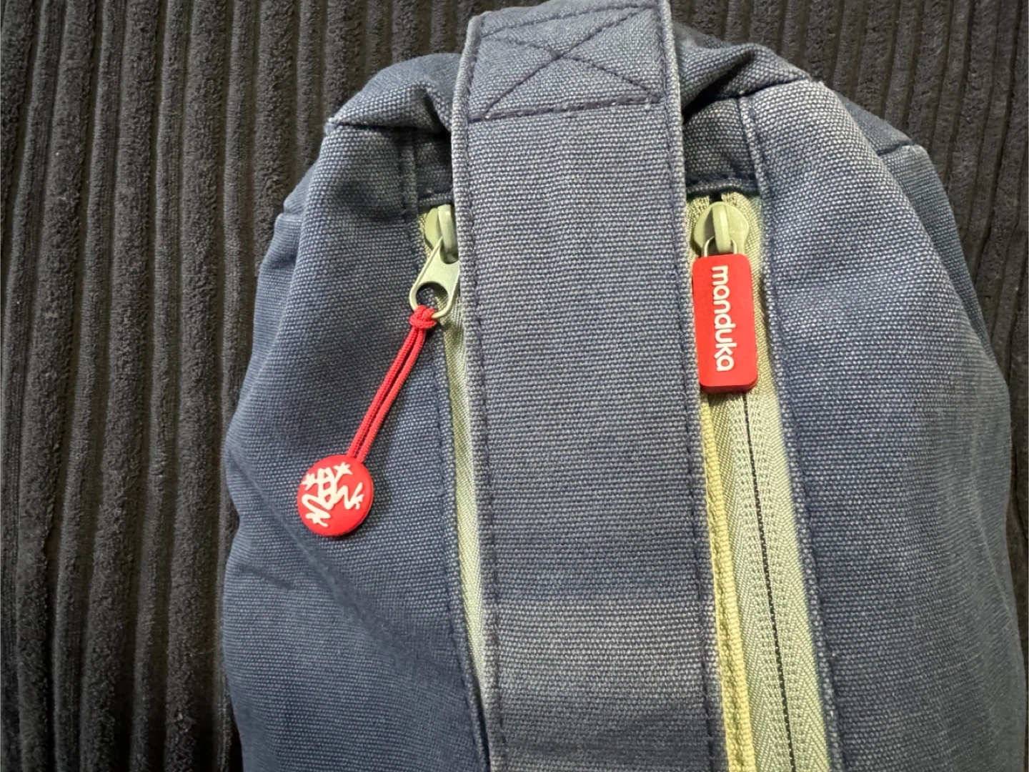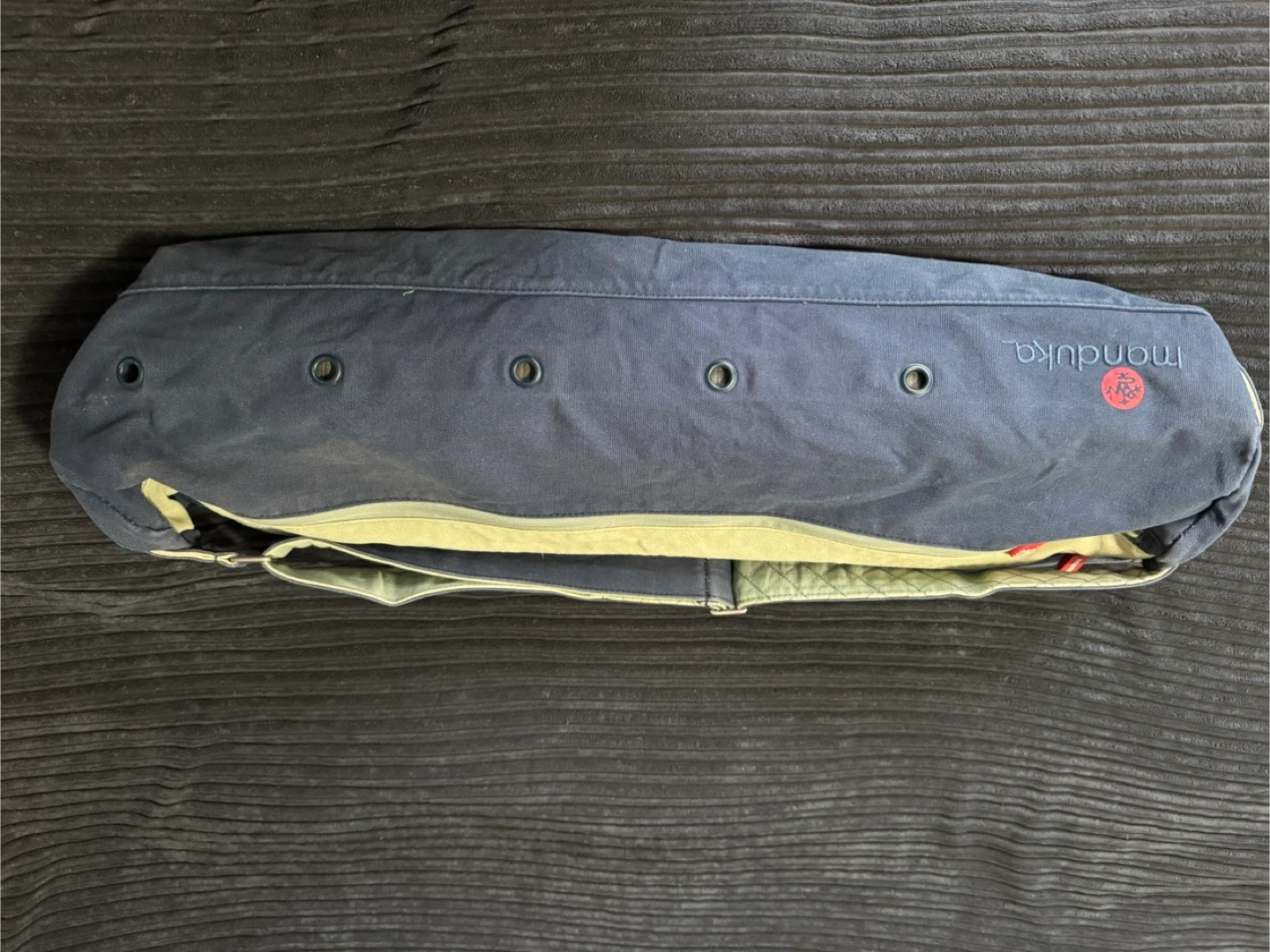 Manduka yoga mat bag in navy blue. Made of durable canvas material, with 2 zippered compartments and strong shoulder strap. Holds a pro Manduka, mat towel, clothing, and water bottle. Zippered pocket for credit cards/cash. And a key hook. It’s in great condition and has been washed.