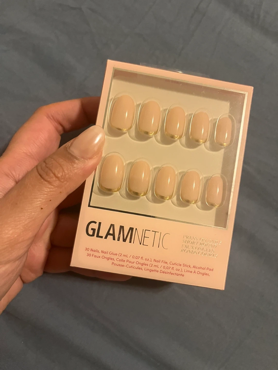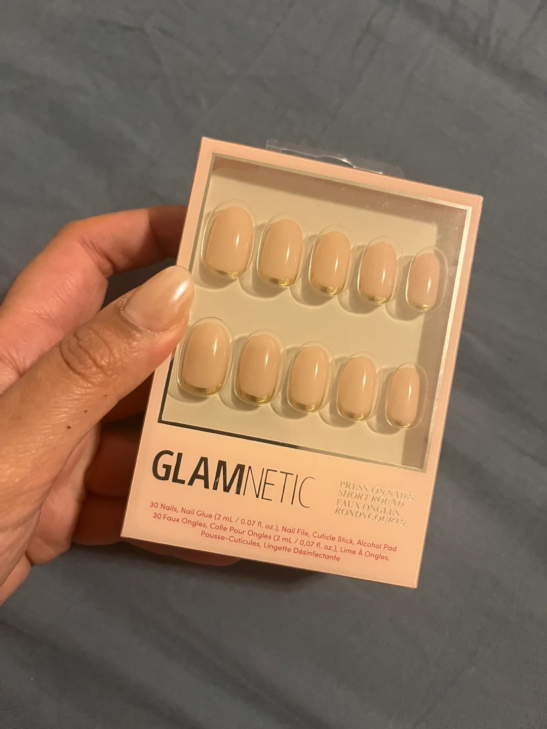GLAMNETIC press-on nails in the 'Goal Digger' style. Includes 30 nails, nail glue, nail file, cuticle stick, and alcohol pad. Short round shape.