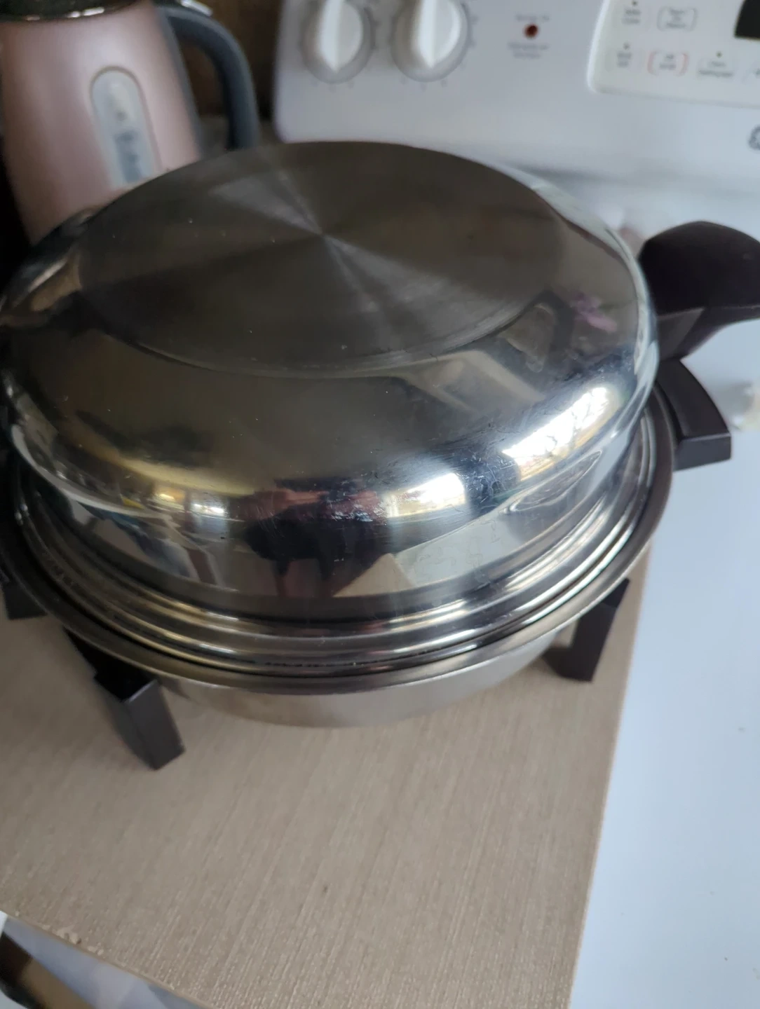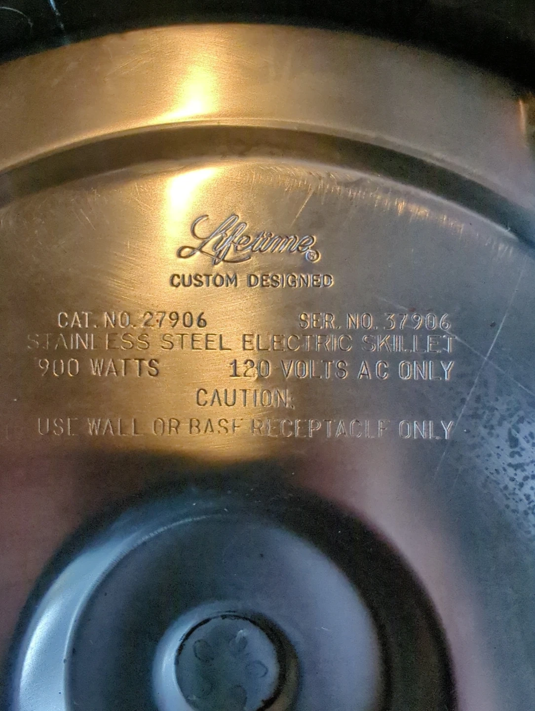 Lifetime Custom Designed stainless steel electric skillet. It's 900 watts and 120 volts AC. Temperature settings are listed on the heat control. Oil filled for eaven cooking