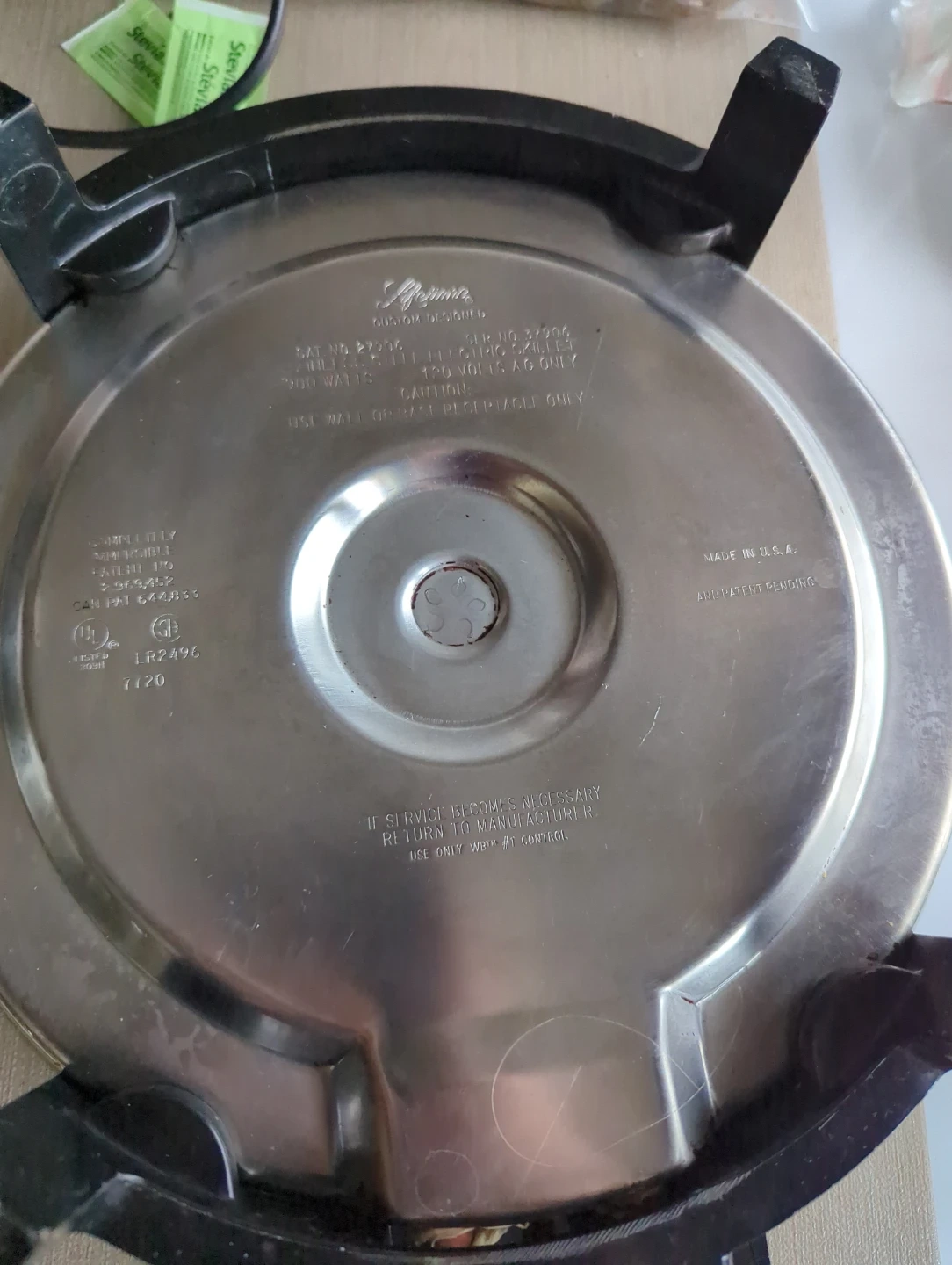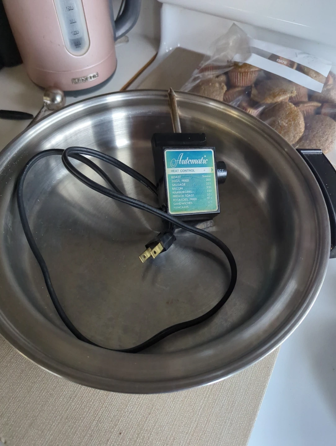 Lifetime Custom Designed stainless steel electric skillet. It's 900 watts and 120 volts AC. Temperature settings are listed on the heat control. Oil filled for eaven cooking