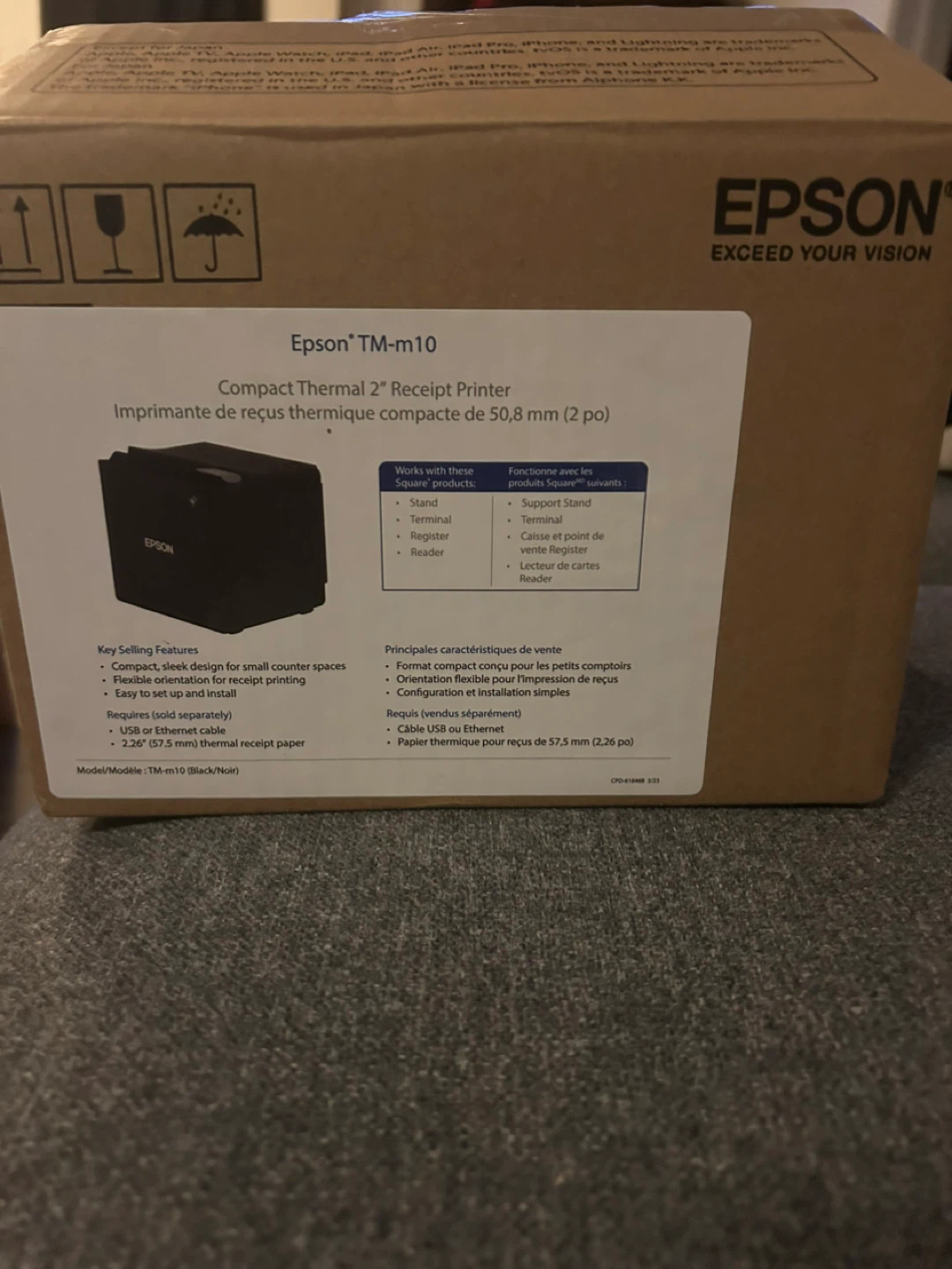 This is an Epson TM-m10 compact thermal receipt printer. It's designed for small counter spaces with flexible orientation and is easy to set up. It requires a USB or Ethernet cable and 2.26" (57.5 mm) thermal receipt paper, sold separately. This printer works with Square products like terminals and readers. This was set up only to find out it does not work with Shopify POS.