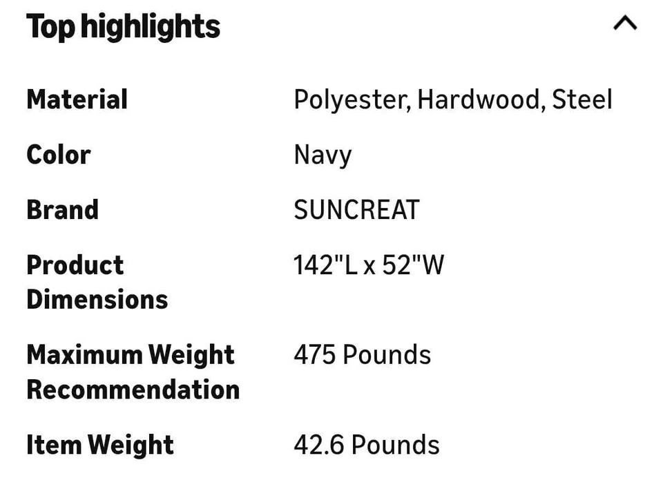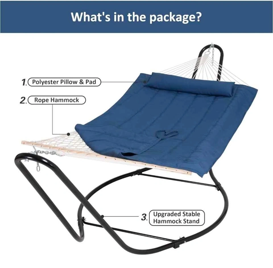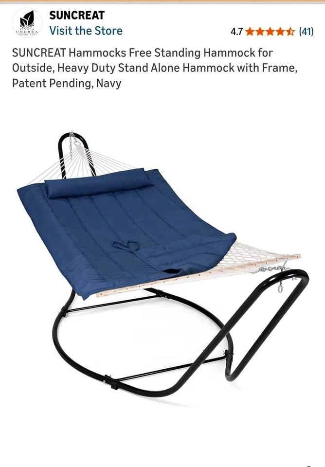 Moving sale. We bought this last summer, and the hammock was brought inside before winter, so it's in excellent condition with no holes. The pad is reversible quilted polyester, detachable for easy cleaning, and has a comfy head pillow. It features a 52-inch hardwood spreader bar for stability and a large, stable freestanding stand made of powder-coated steel. The hammock bed is extra large (76" L x 52" W) and supports up to 475 pounds, perfect for sharing. The stand is 12 ft, easy to assemble without tools, and can be disassembled easily. Pick up in Buffalo Grove. Cash or Zelle pay. Check my profile for other items for sale as I'm moving and decluttering.