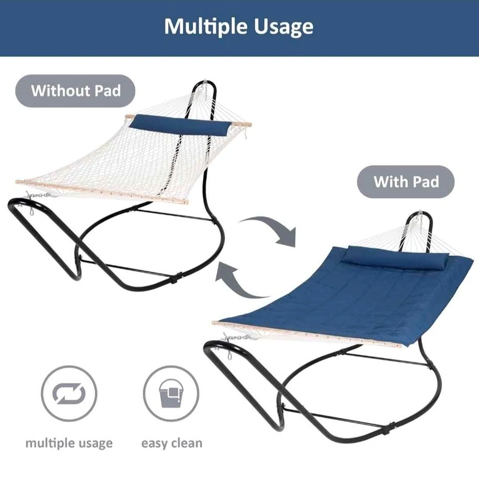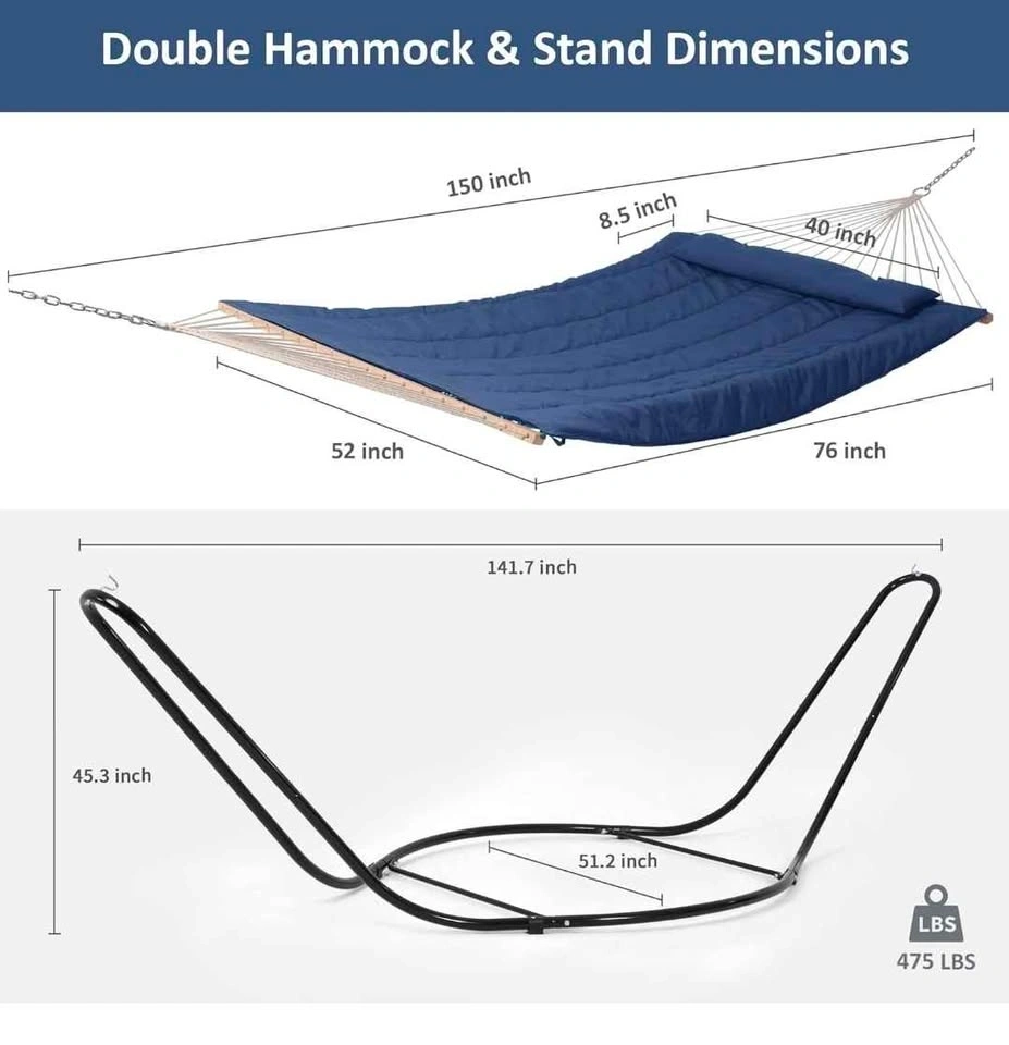 Moving sale. We bought this last summer, and the hammock was brought inside before winter, so it's in excellent condition with no holes. The pad is reversible quilted polyester, detachable for easy cleaning, and has a comfy head pillow. It features a 52-inch hardwood spreader bar for stability and a large, stable freestanding stand made of powder-coated steel. The hammock bed is extra large (76" L x 52" W) and supports up to 475 pounds, perfect for sharing. The stand is 12 ft, easy to assemble without tools, and can be disassembled easily. Pick up in Buffalo Grove. Cash or Zelle pay. Check my profile for other items for sale as I'm moving and decluttering.