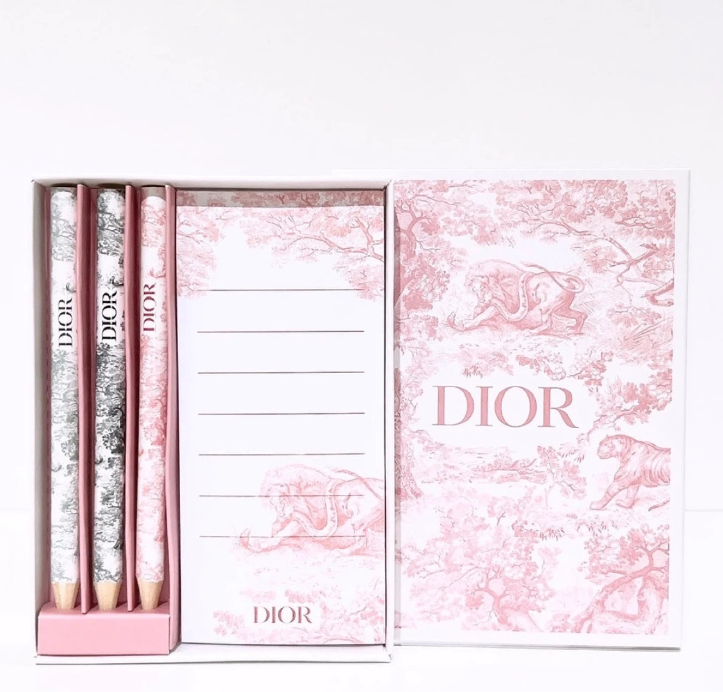 This is a Dior set containing three pencils with branded designs and a pink-themed notepad. The pencils feature the Dior logo and delicate patterns. It's a lovely stationery set.