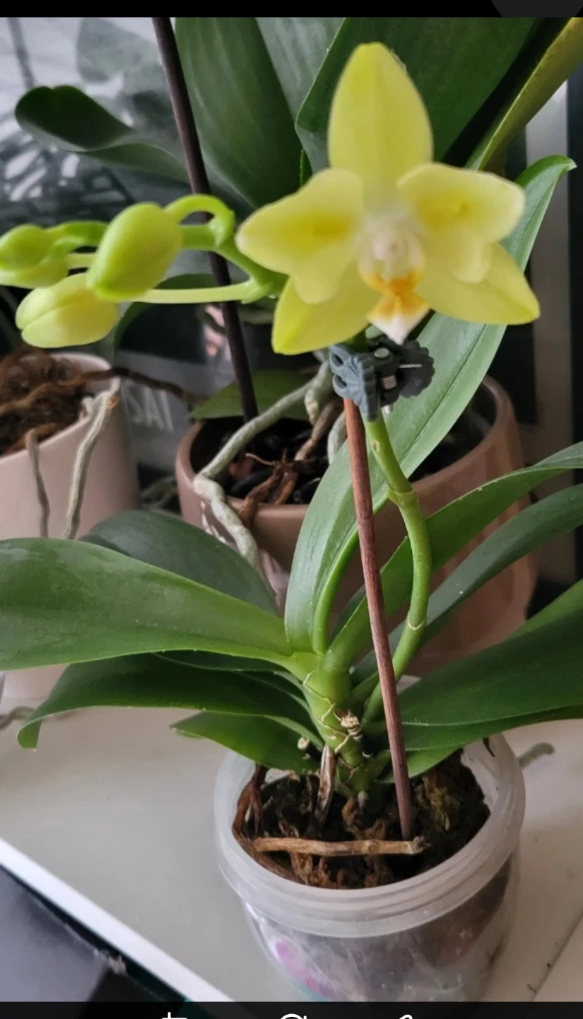 Selling a lovely yellow Phalaenopsis orchid! It's just starting to bloom and has some buds ready to open. It comes in a clear plastic pot, perfect for any indoor space.