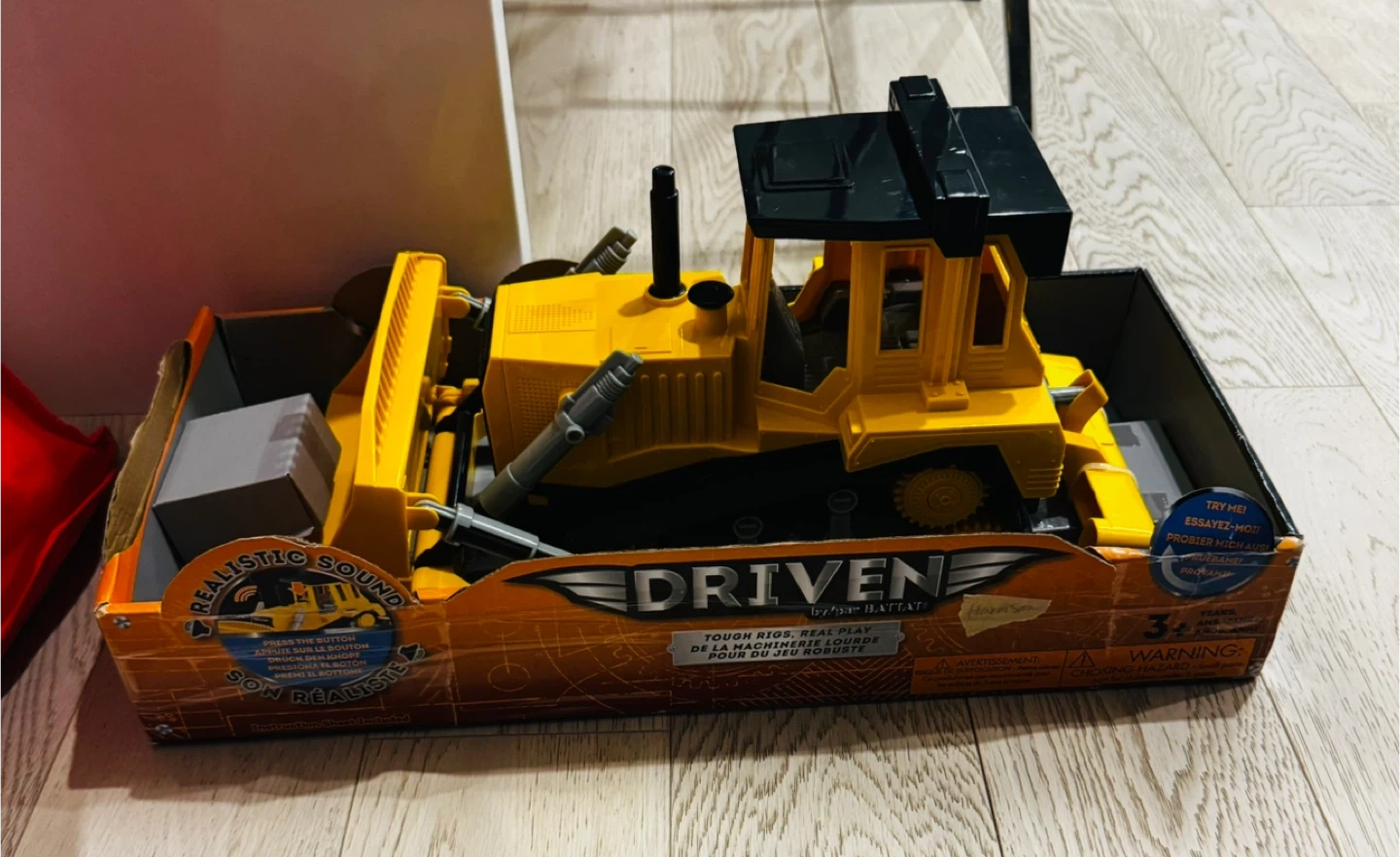 This is a Driven Tough Rigs bulldozer toy with realistic sound features. It's yellow and made of plastic. Comes in its original box. Suitable for ages 3 and up.