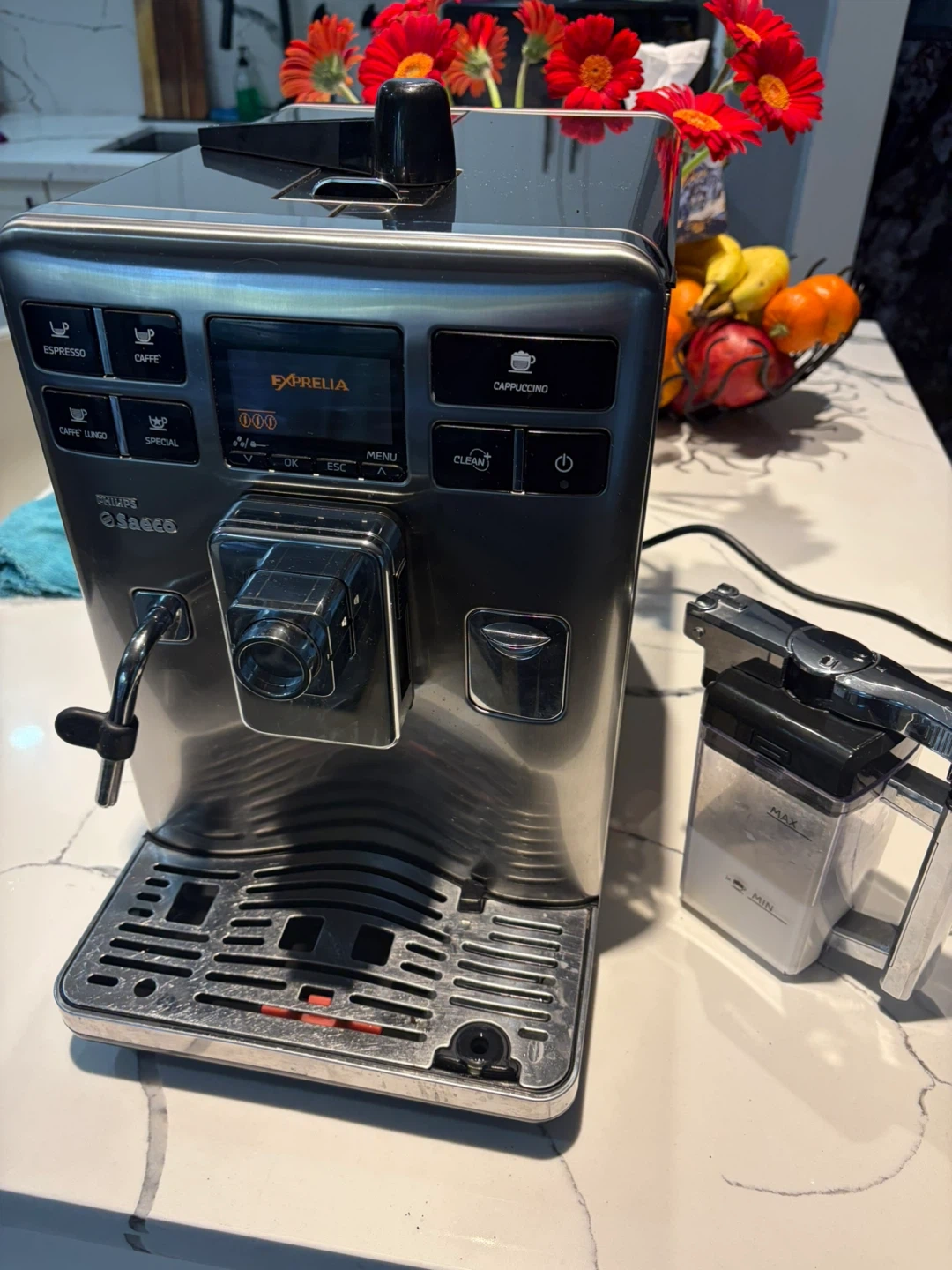Premium Philips Saeco fully automatic espresso machine with integrated milk system.