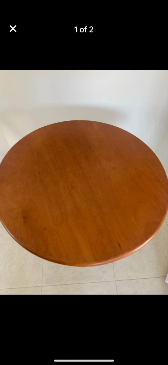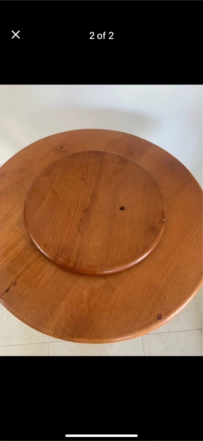 This is a round wooden lazy susan. It's made of solid wood with a warm finish. The turntable spins smoothly for easy access to items.