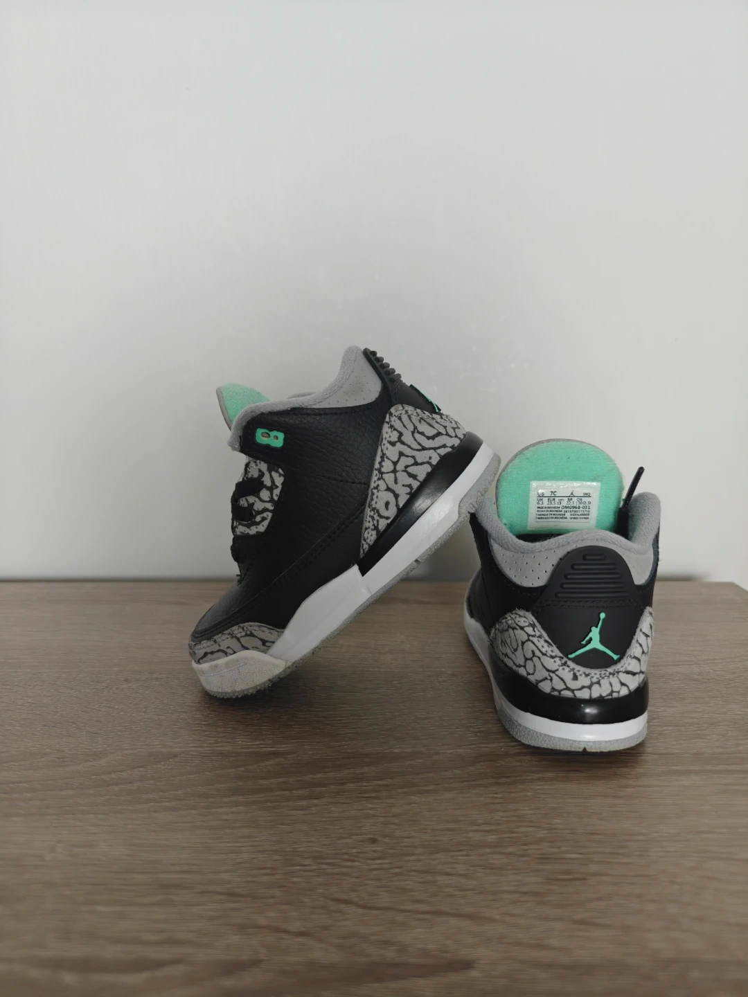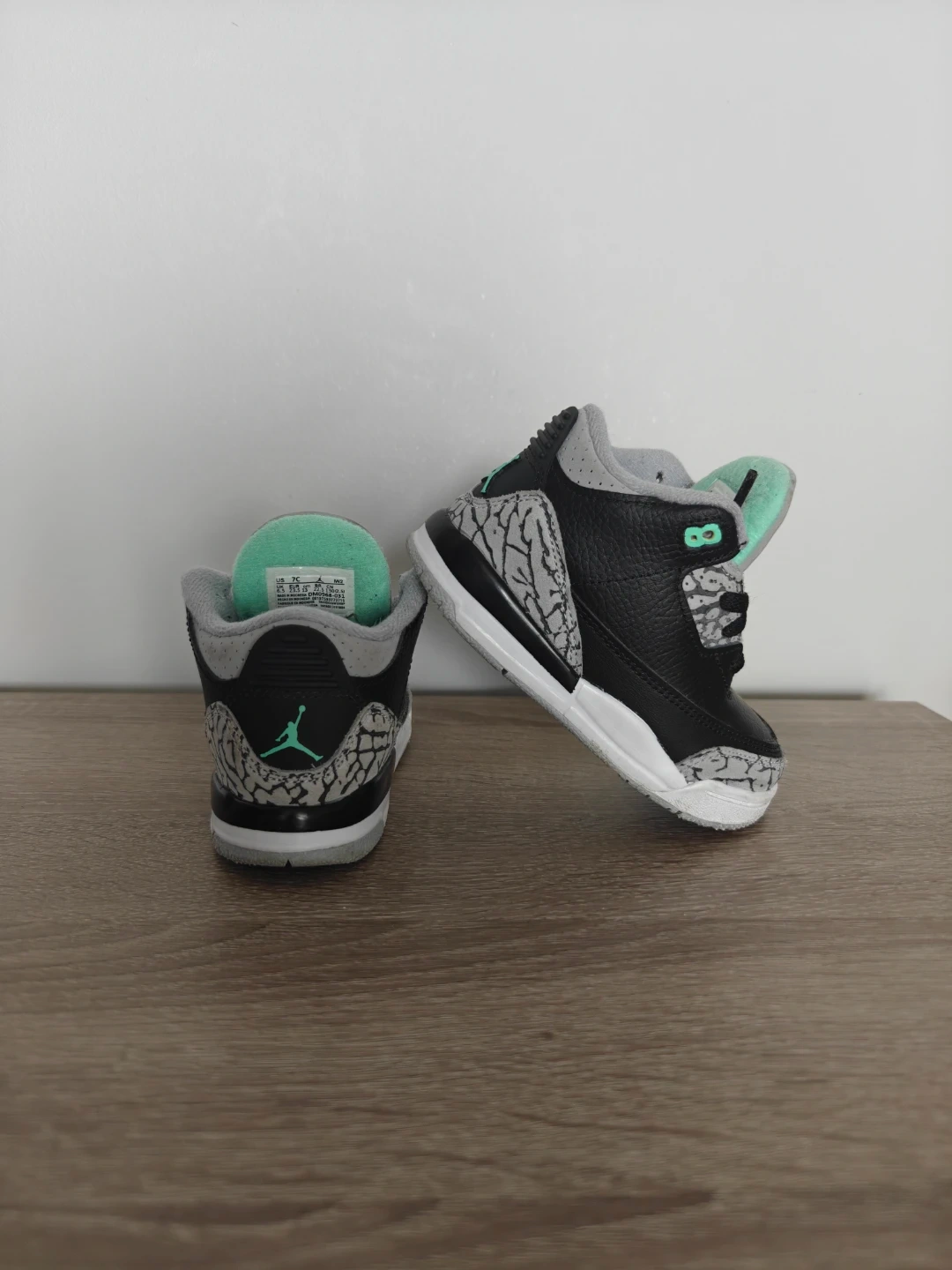 Toddler Jordan 3 Retro sneakers in black, grey, and mint green. Size 7C. Made in Indonesia.