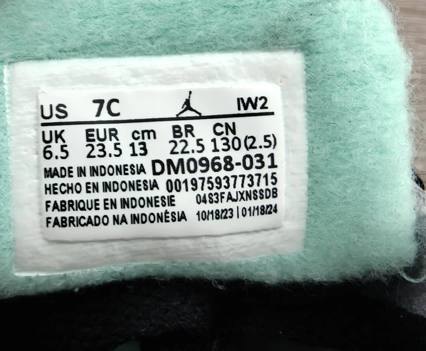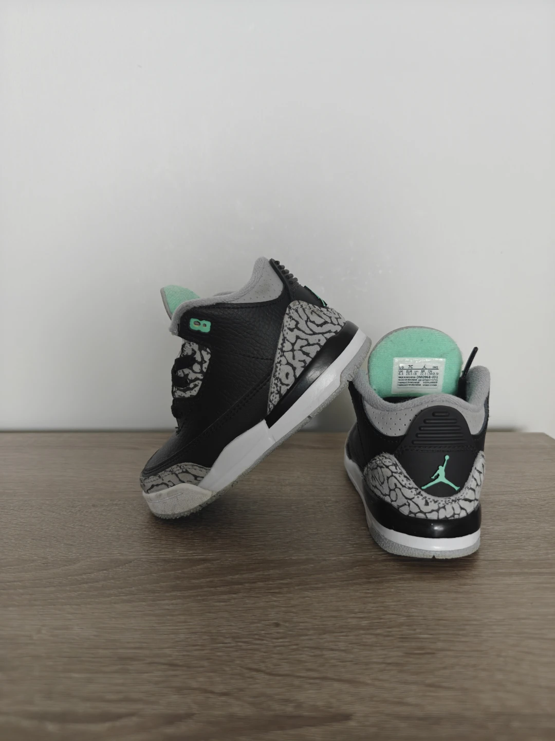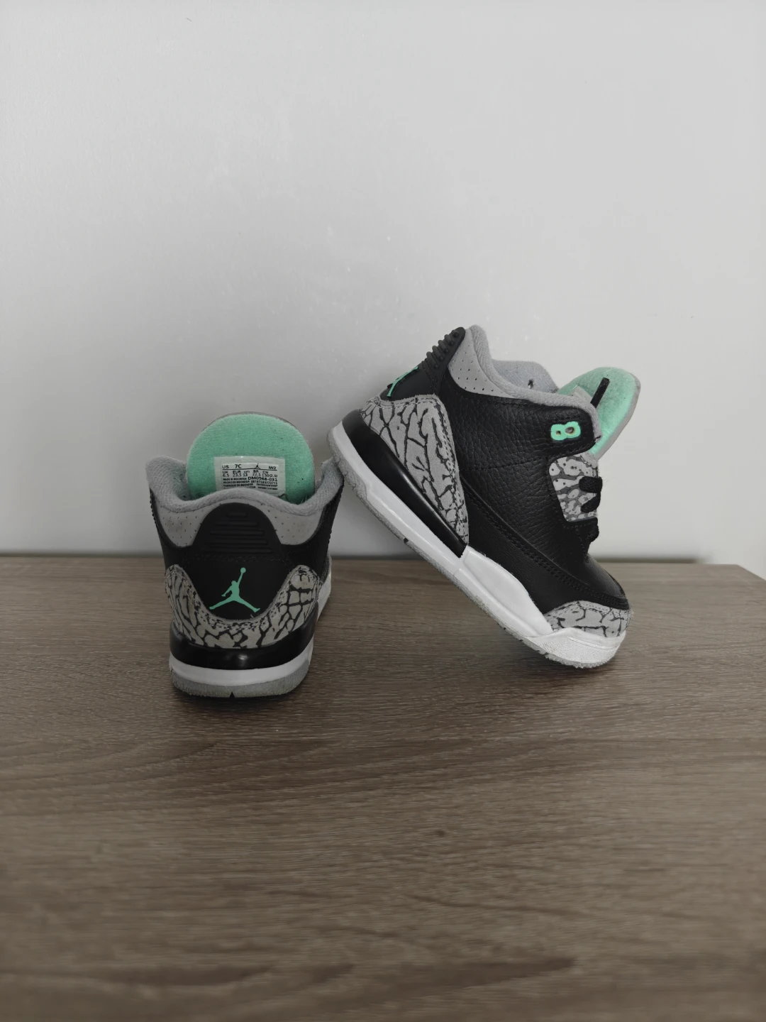 Toddler Jordan 3 Retro sneakers in black, grey, and mint green. Size 7C. Made in Indonesia.