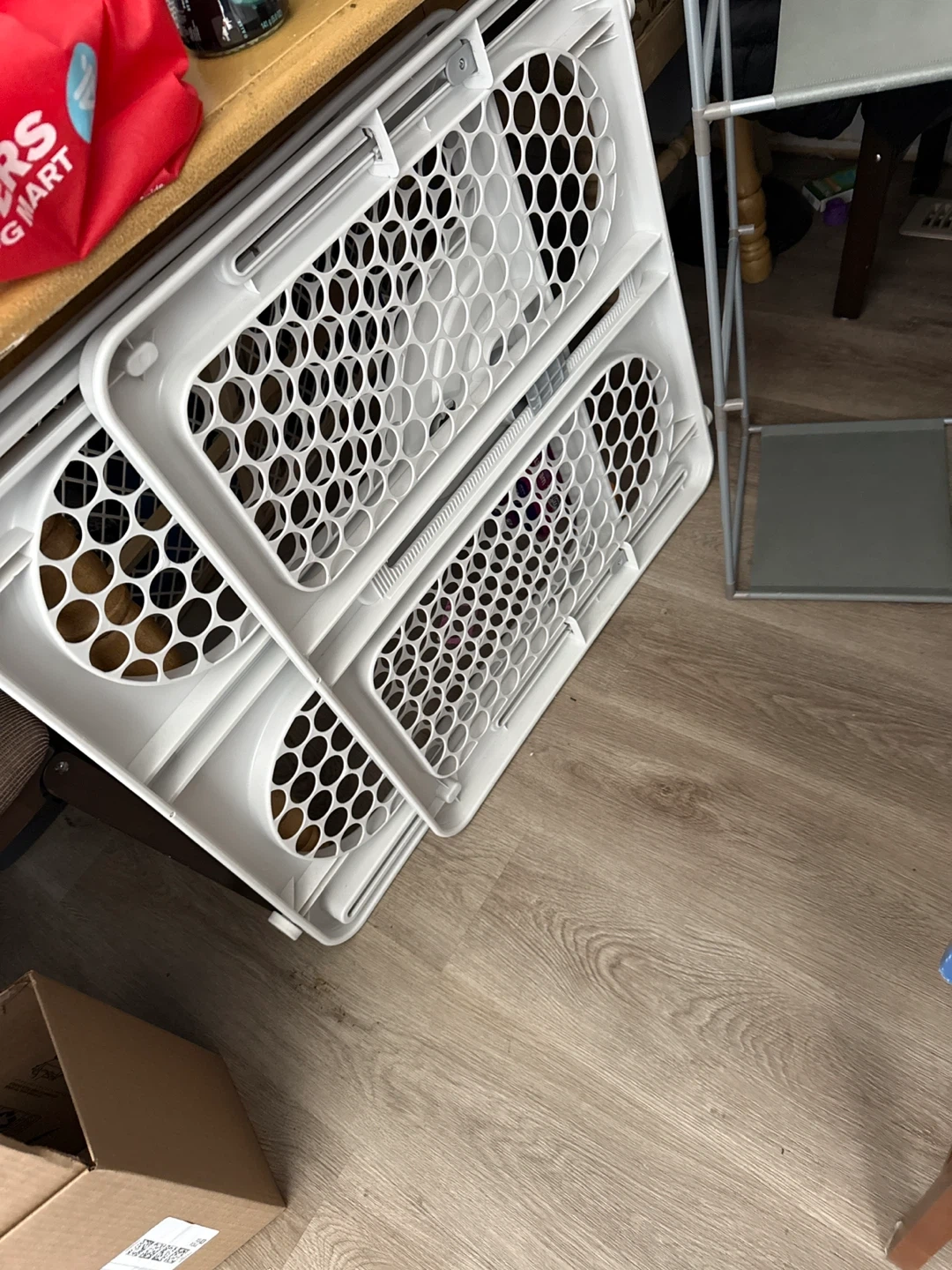 This is a white plastic baby gate. It's designed for safety and has a portable design. It's great for keeping pets or little ones contained.