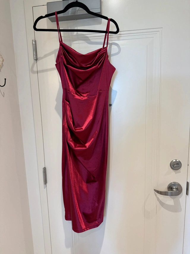 Add a touch of sparkle to your night with this form fitting burgundy satin dress, featuring a bodycon silhouette and shiny material, perfect for turning heads. I'm selling this dress, brand new! Key Features: - Colour: Burgundy - Fit: Bodycon - Material: Satin - Condition: Excellent Looking for a dress that combines elegance with a touch of glamour? This burgundy dress is your go-to choice. Grab it before someone else does! If you see this ad, the dress is still available, so don't hesitate to reach out! Cash only. pick up Quarry Park SE or Mahogany SE so good