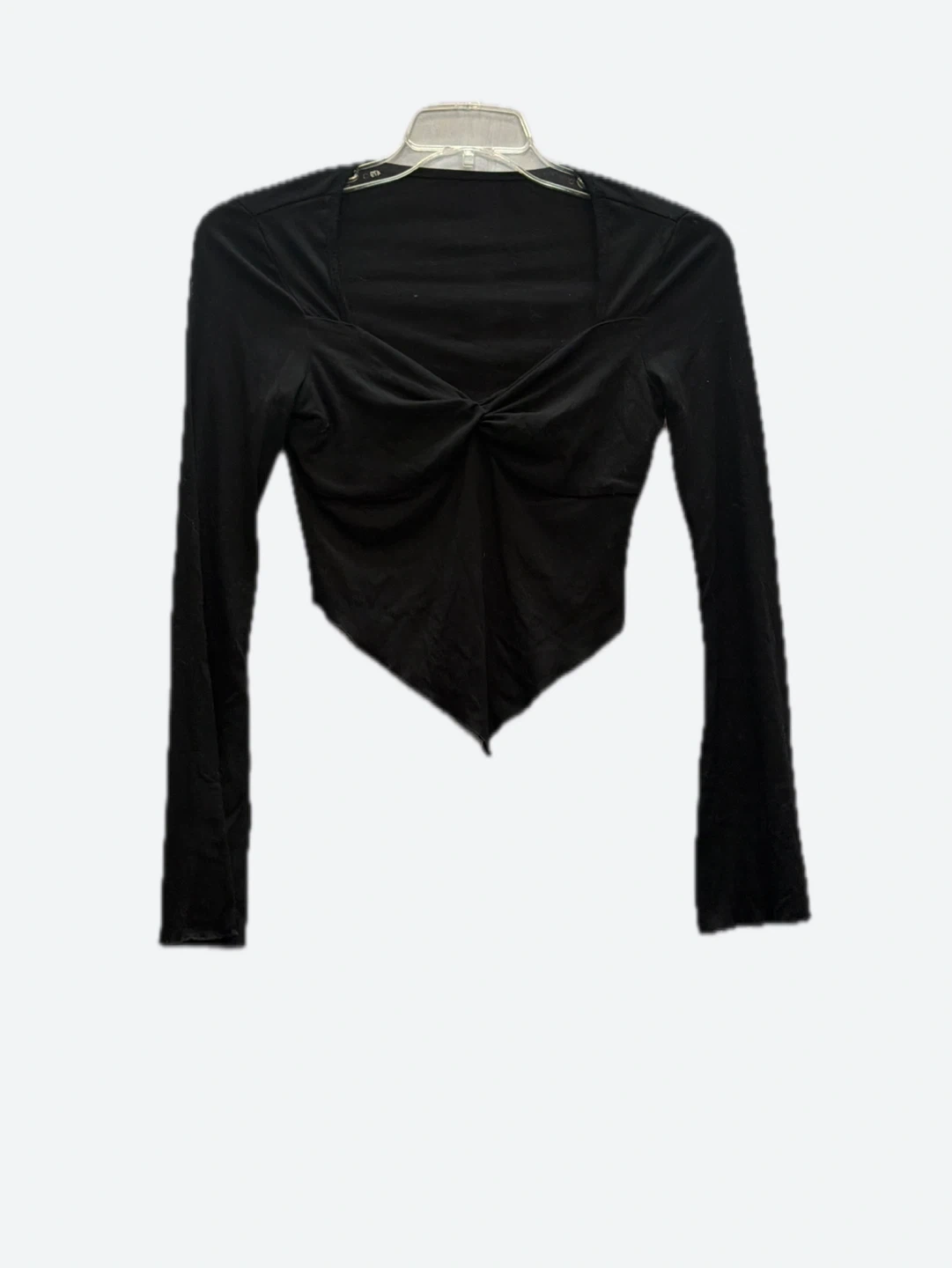 This black long-sleeve top features a stylish twist-front detail and a flattering square neckline. It's made from a soft, stretchy material for comfortable wear. The asymmetrical hem adds a modern touch to the design.