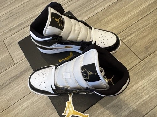 The Jordan Air Jordan 1 Mid SE GS in Black Metallic Gold White features a stylish colorblock pattern with a round toe and lace-up closure. Made with patent leather material, these sneakers have a flat heel and rubber outsole, perfect for casual wear or basketball activities. The iconic Air Jordan brand logo adds a touch of sports theme to these sneakers, suitable for both boys and girls in size 6.5Y or 8W. Ideal for summer, fall, and spring seasons.