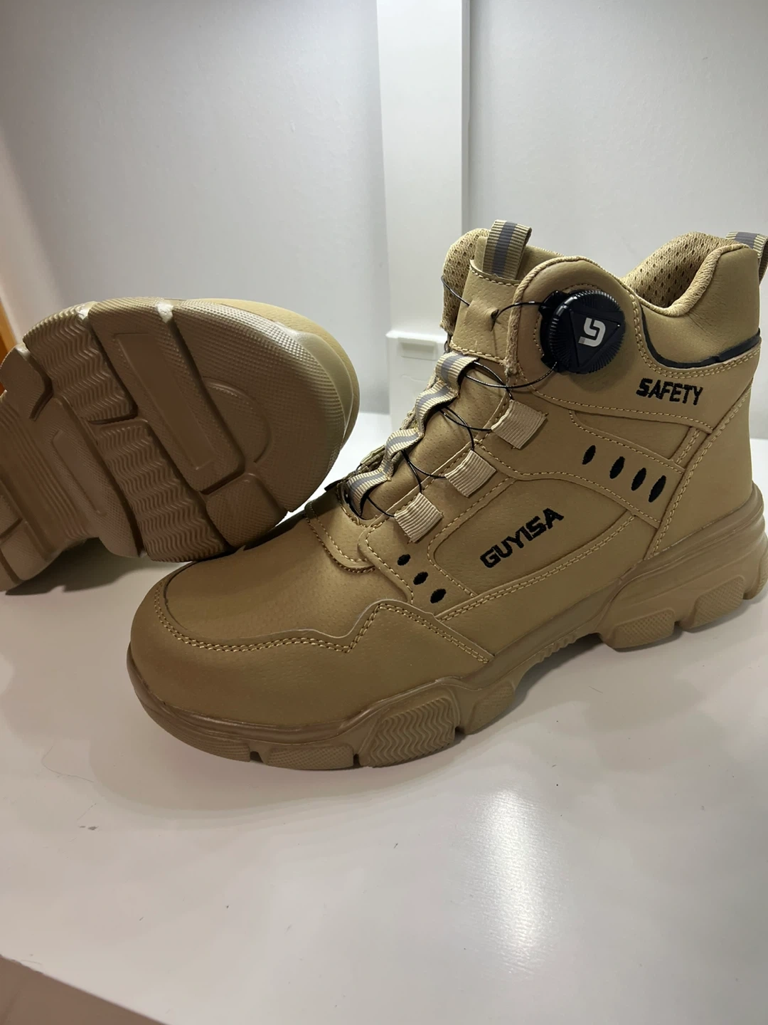 GUYISA safety boots. Tan color. Features a Boa lacing system for a quick and secure fit. Designed for work and protection. Includes extra laces. Size 9.