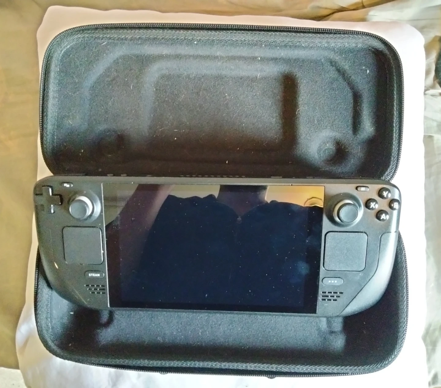 A Steam Deck handheld gaming console is up for grabs! It comes with its original protective carrying case. This device offers a portable PC gaming experience.
