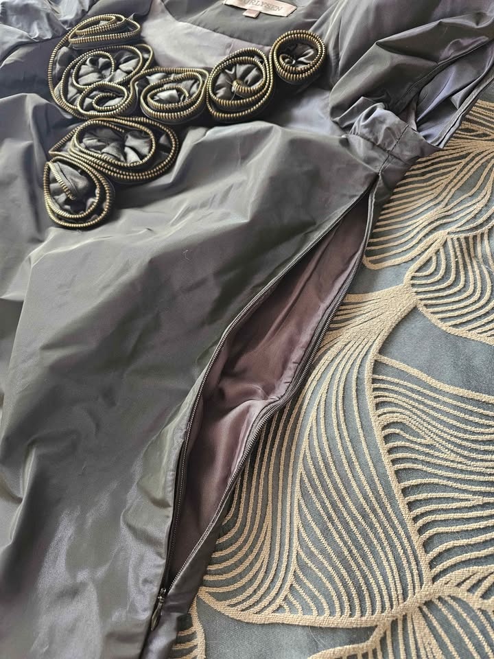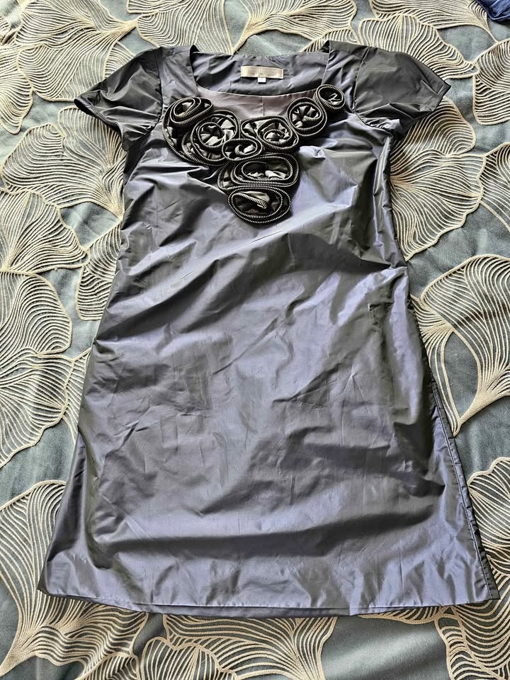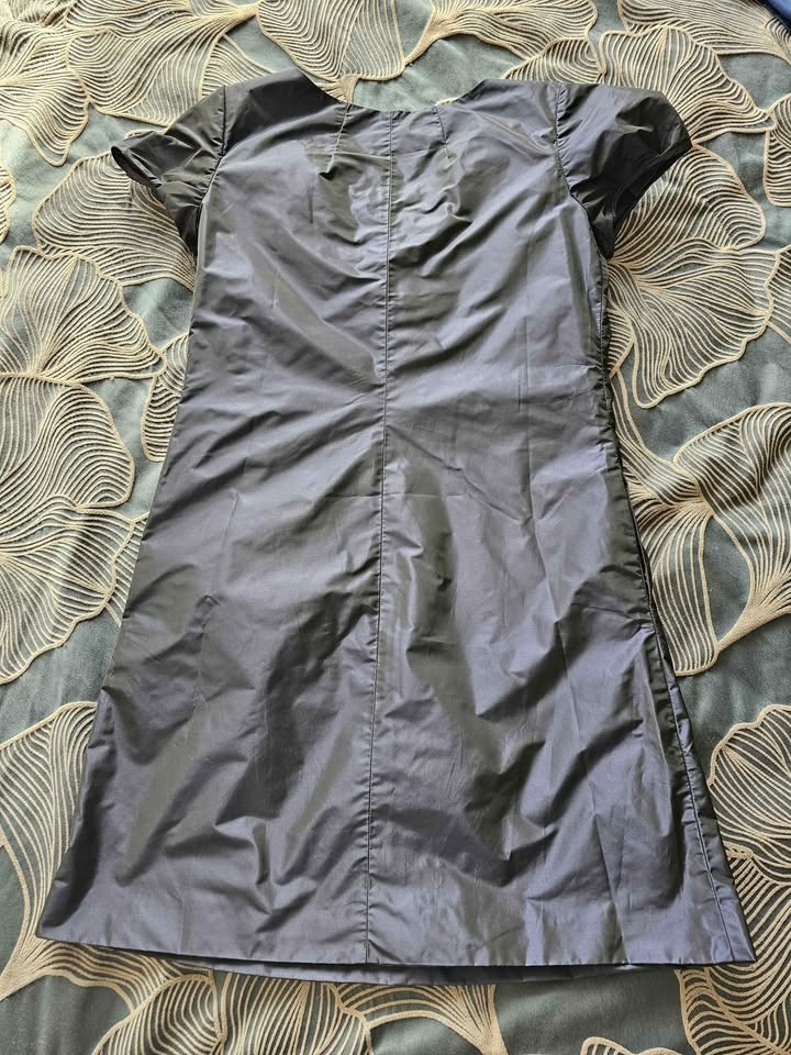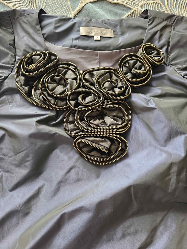 Unique short sleeve dress with a cool zipper detail around the neckline. Dark gray blue color and shiny fabric. Size S: chest 84cm, waist 82cm, length 84cm. Can pick up in North York, Scarborough, Markham, or Richmond Hill.