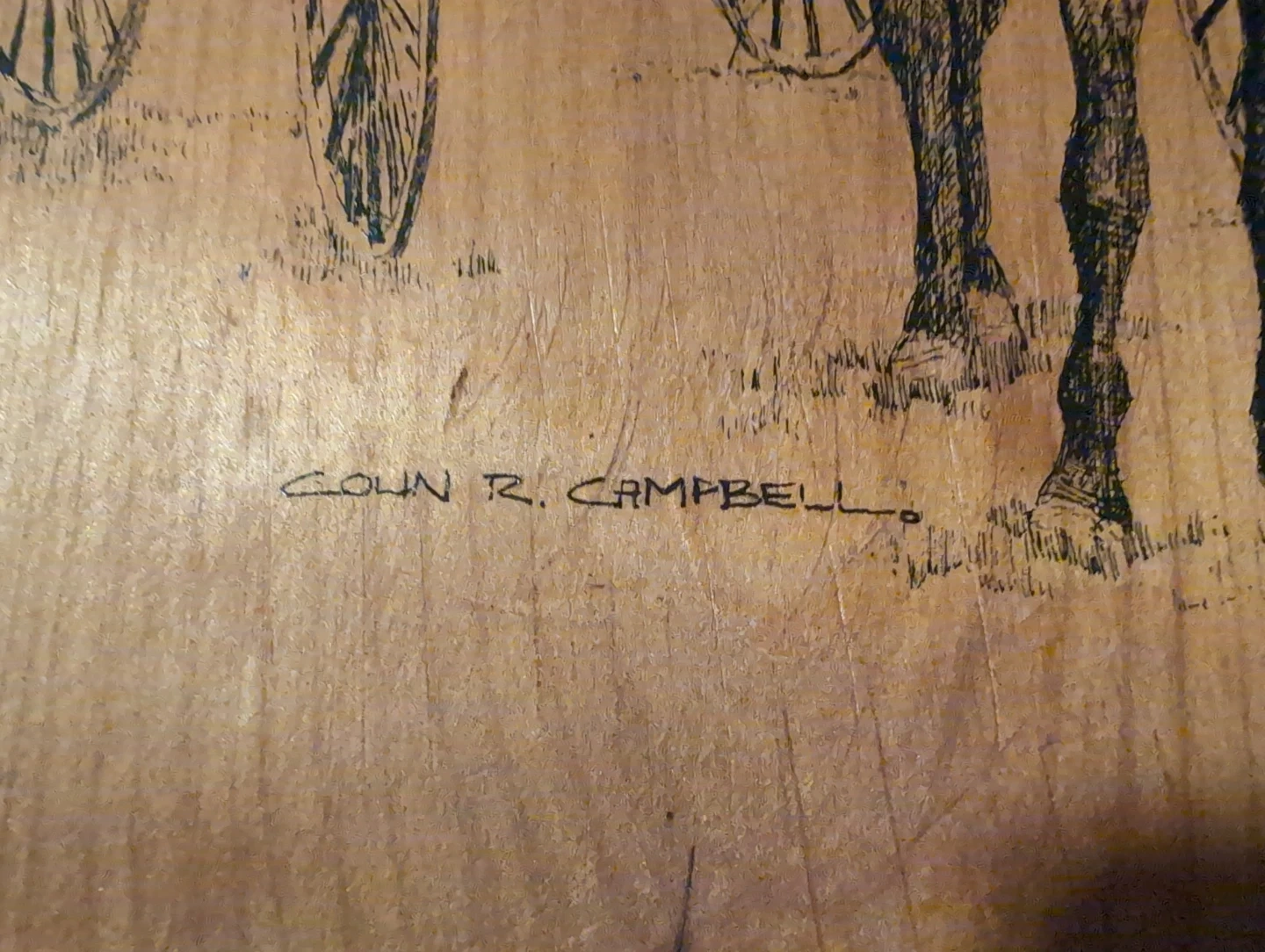 Unique piece of wood art featuring a horse-drawn carriage by Colin R Campbell! It's a striking piece that would look great in any room looks to be made out of oak wood and the horse drawing looks to be burnt into the wood