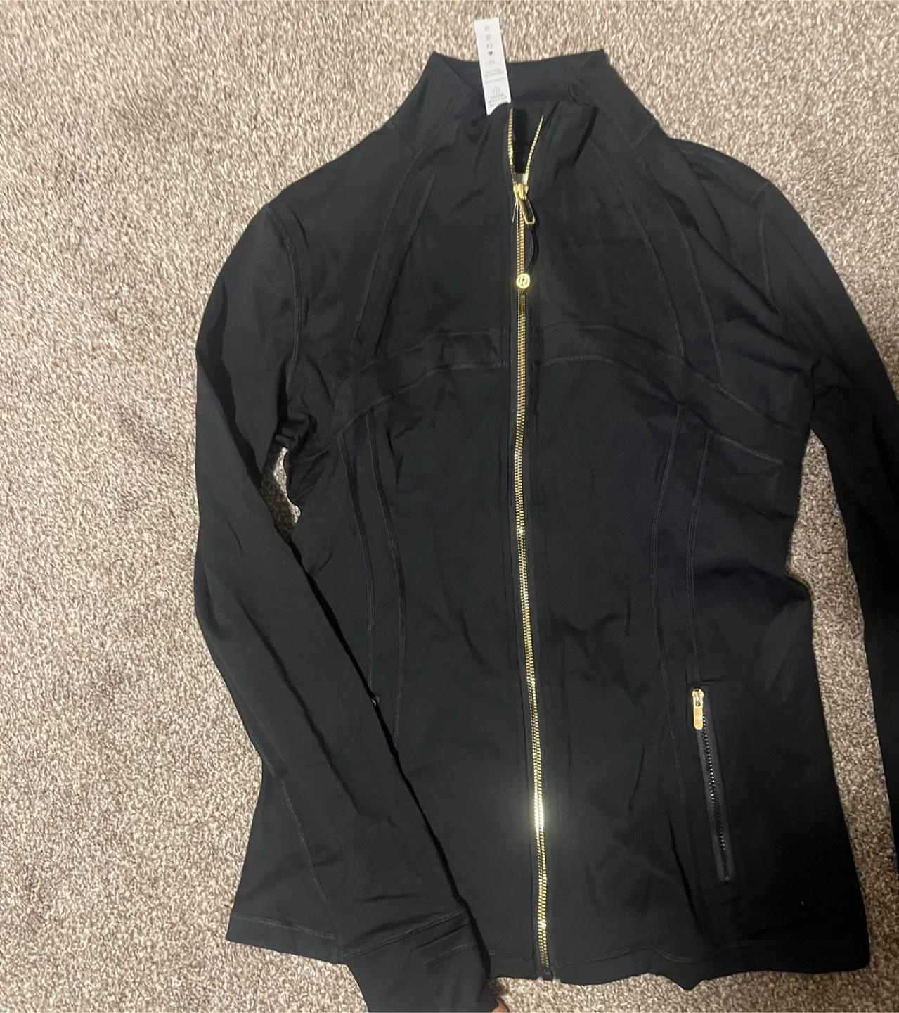 This is a Lululemon Define Jacket in Nulu fabric and black. It has a full zip closure and zippered pockets. Thumbholes are built into the cuffs.