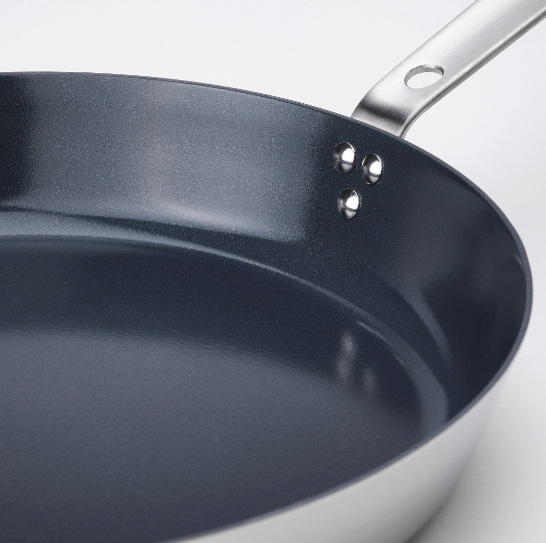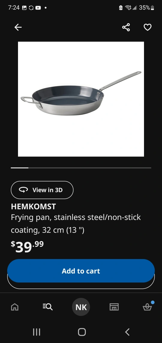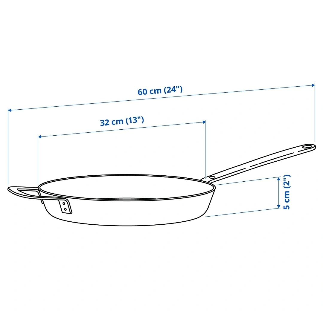 Hemkomst frying pan from IKEA! This pan is stainless steel with a non-stick coating. It measures 32 cm (13 inches) in diameter. Originally bought for $39.99