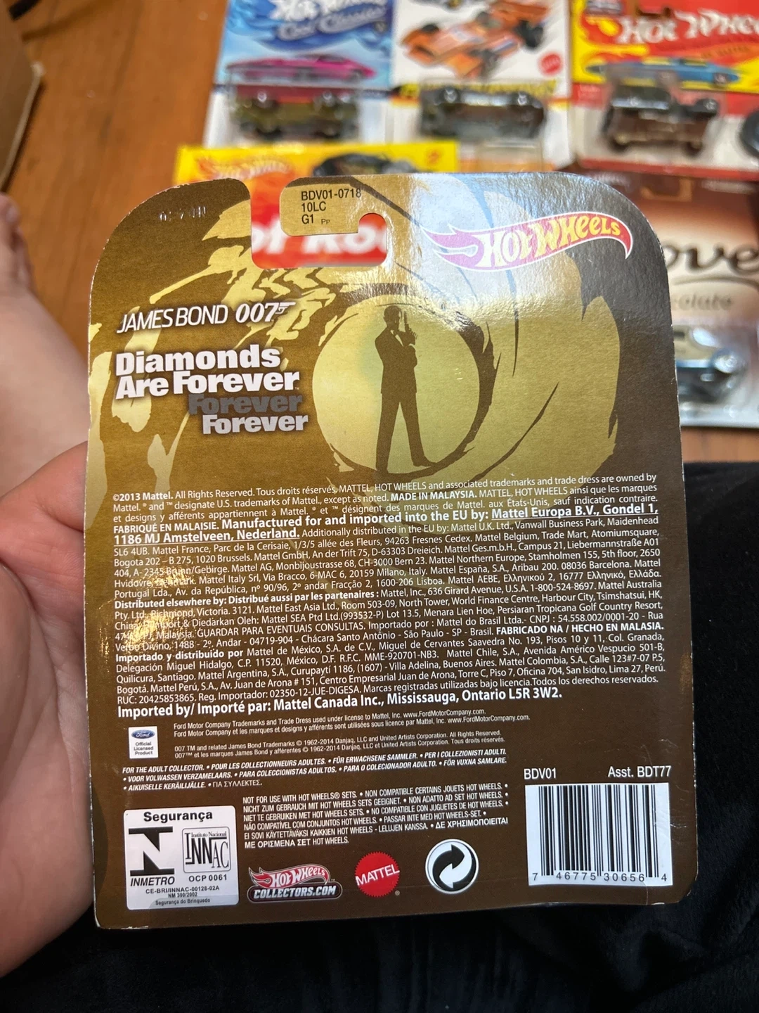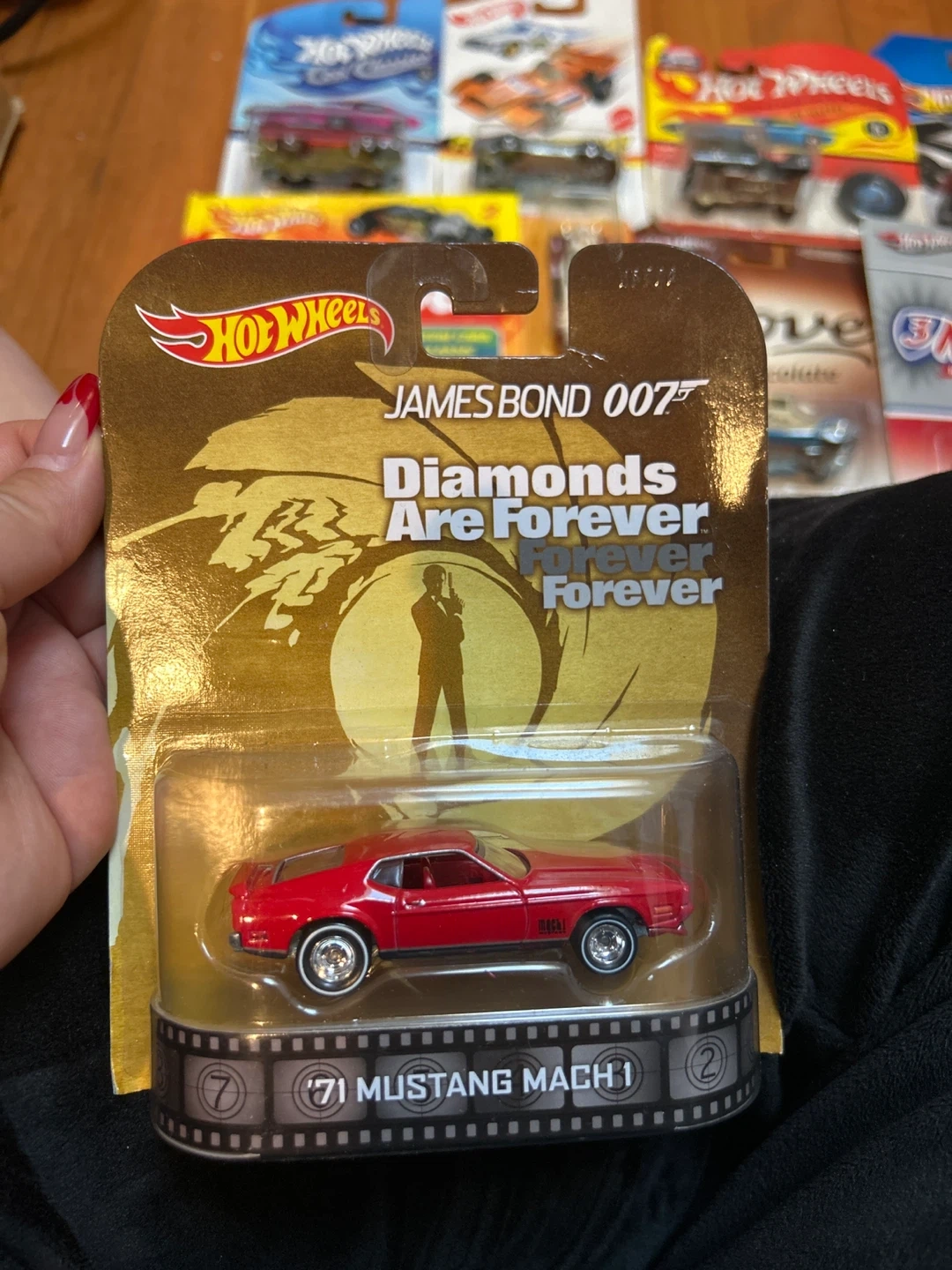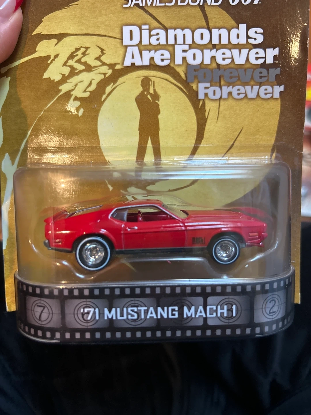 This is a Hot Wheels '71 Mustang Mach 1 die-cast car from the James Bond 'Diamonds Are Forever' collection. It's a 1:64 scale model. It's perfect for collectors or fans of the James Bond franchise!