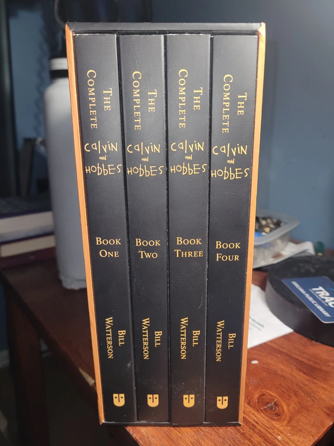 This is the complete collection of Calvin and Hobbes comic strips. It includes four hardcover books detailing the adventures of Calvin and his tiger, Hobbes. Authored by Bill Watterson.