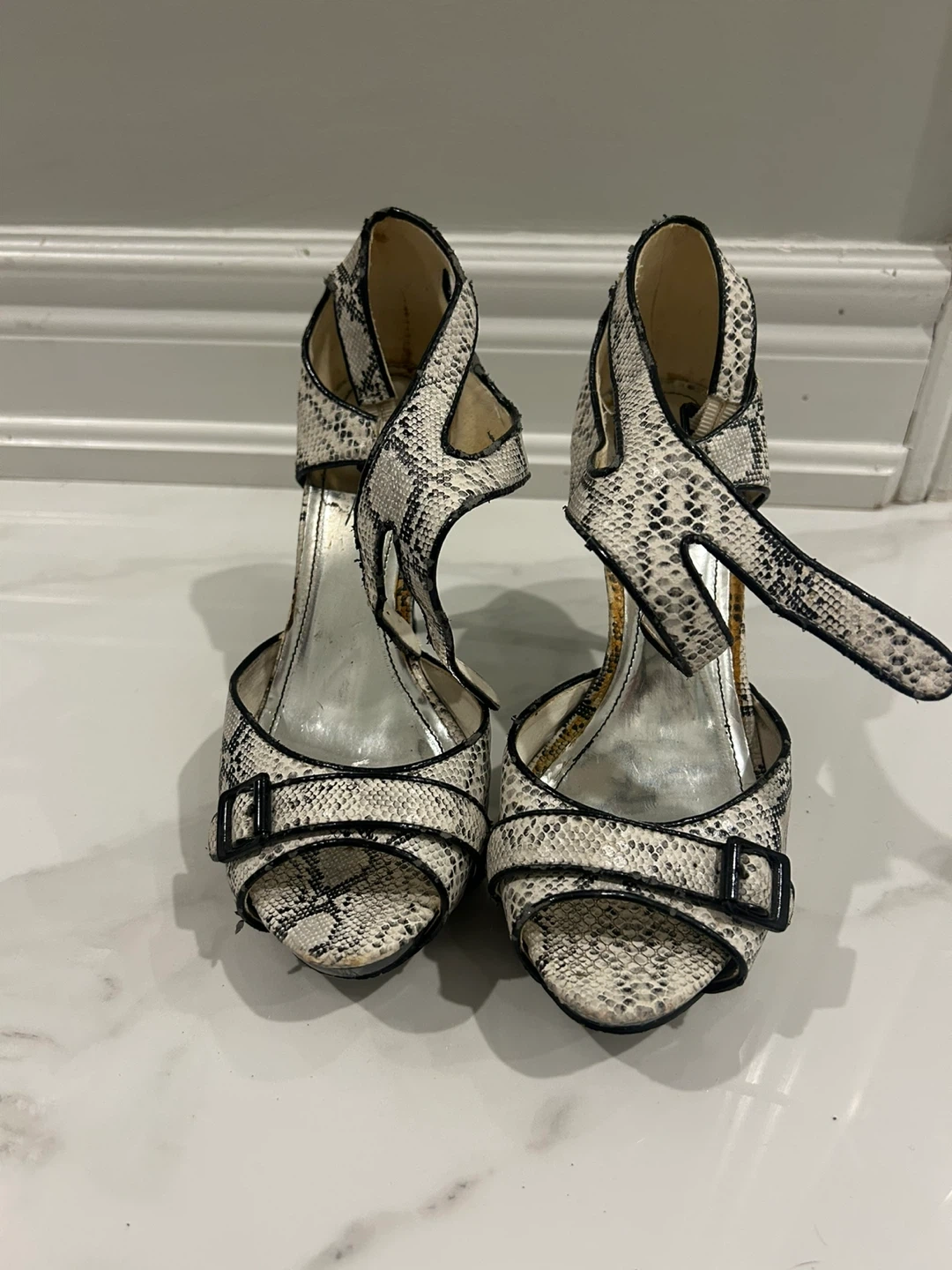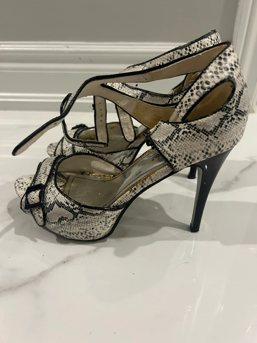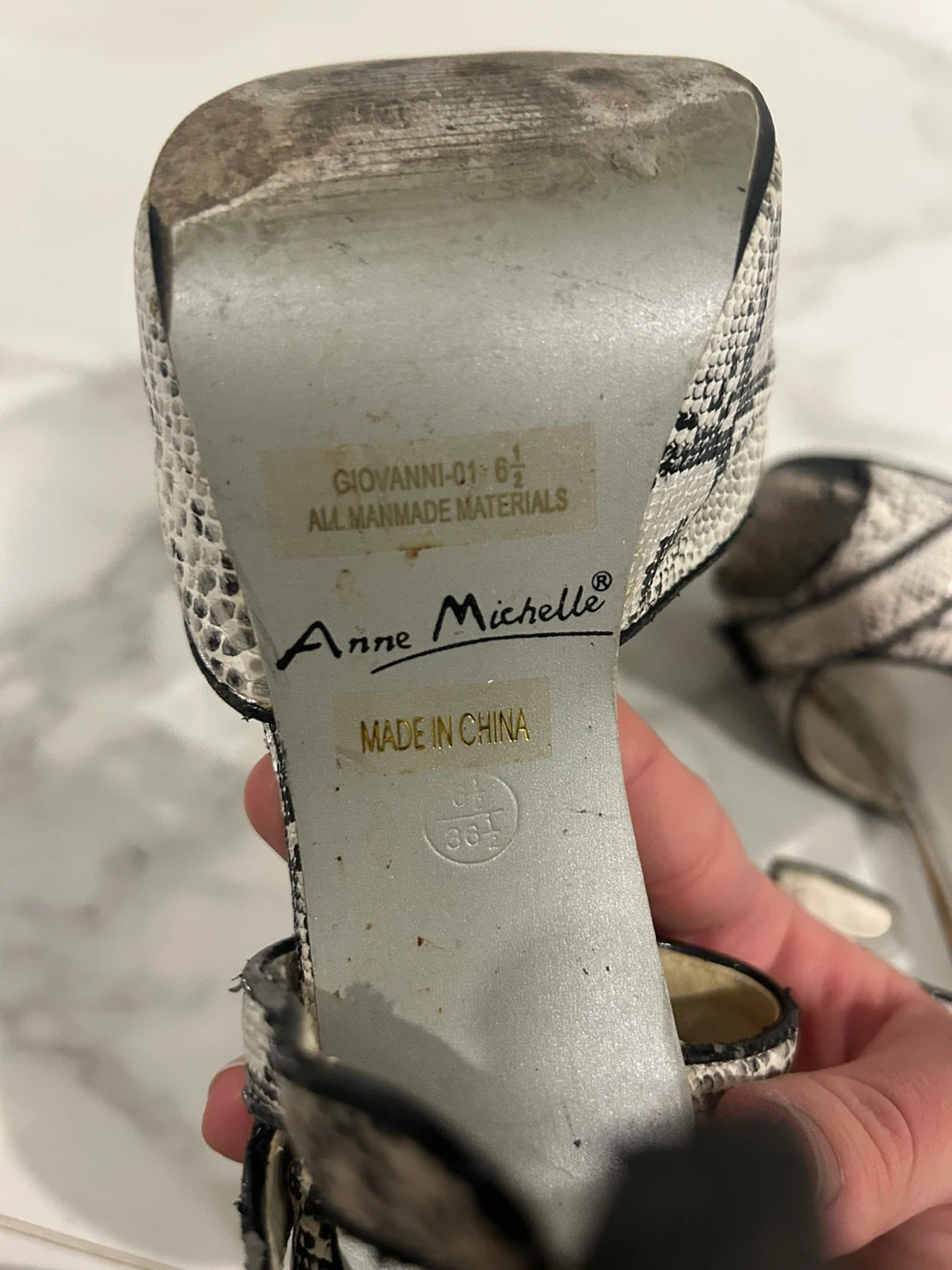 Selling a pair of Anne Michelle heels. They are a size 6 1/2 and made of all manmade materials. They have a snakeskin print and black heels. There are some signs of wear.