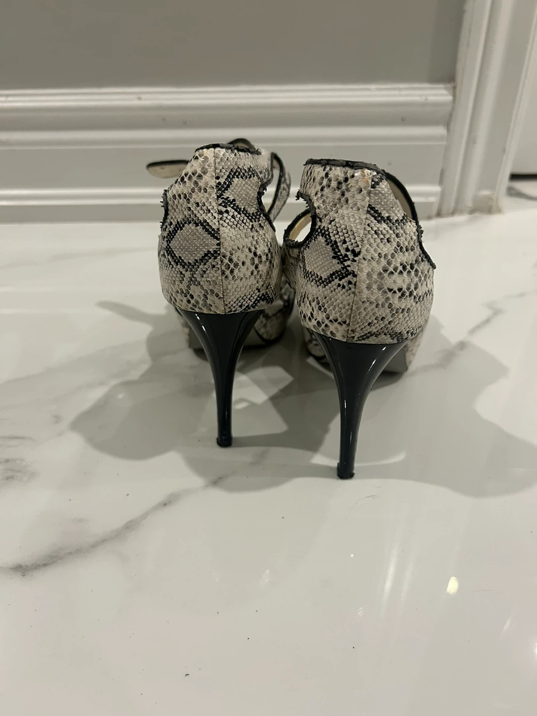 Selling a pair of Anne Michelle heels. They are a size 6 1/2 and made of all manmade materials. They have a snakeskin print and black heels. There are some signs of wear.