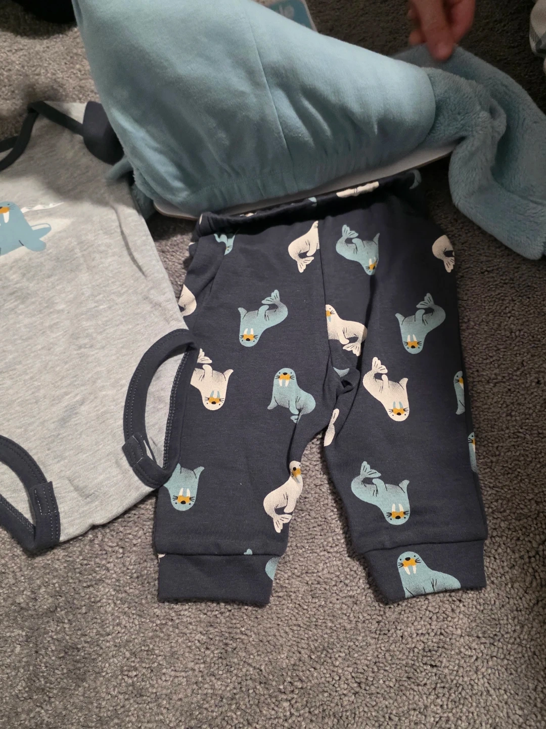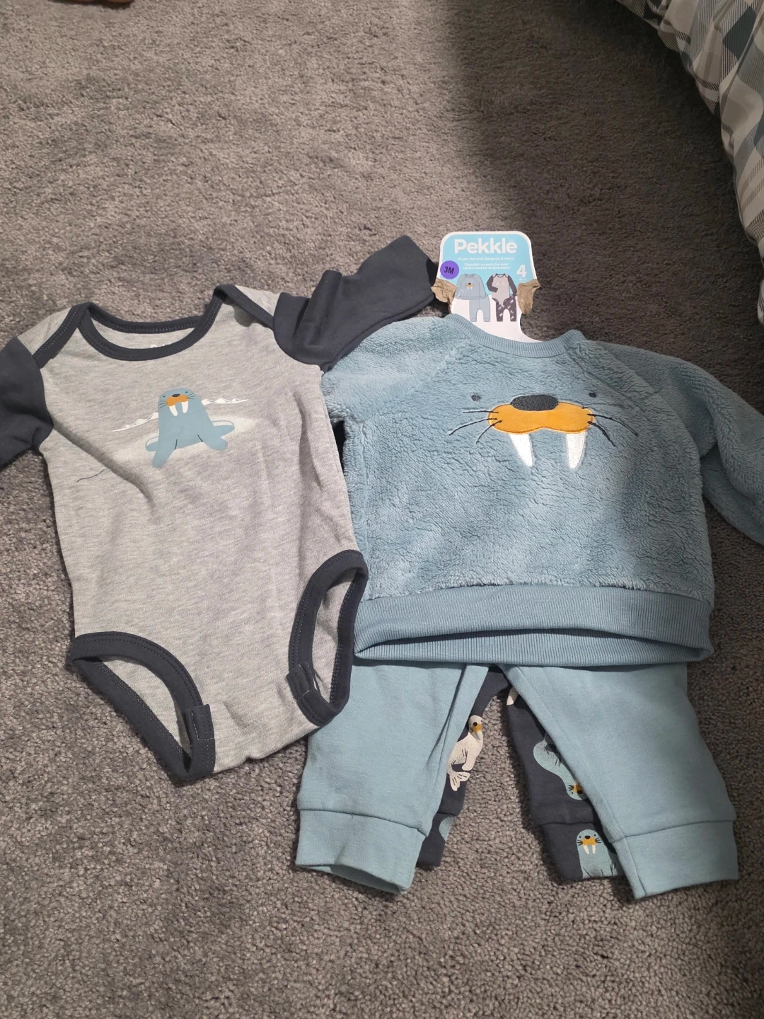 This 4-piece Pekkle outfit set includes a bodysuit, sweater, and 2 pants. The bodysuit is grey with a walrus graphic, and the pants feature a repeating pattern of walruses and birds and a blue one The blue sweater has a fuzzy texture and a walrus face design. It's suitable for babies 3-6 months.