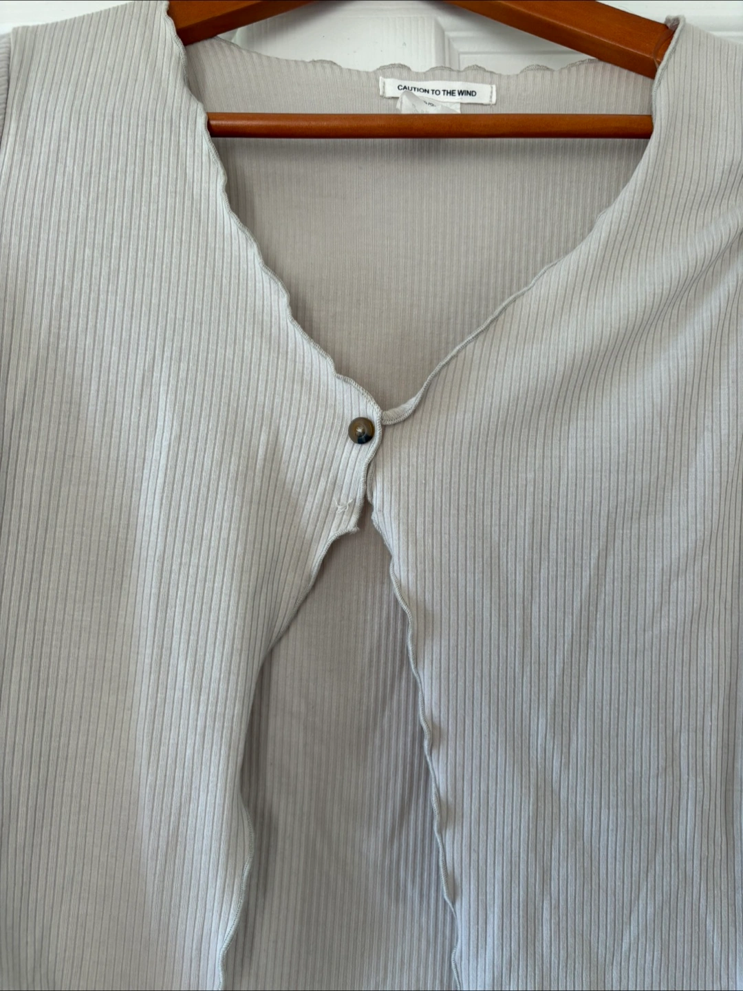 Here's a cute cardigan from Caution to the Wind! It's a light grey colour and size small. Perfect for layering or wearing on its own