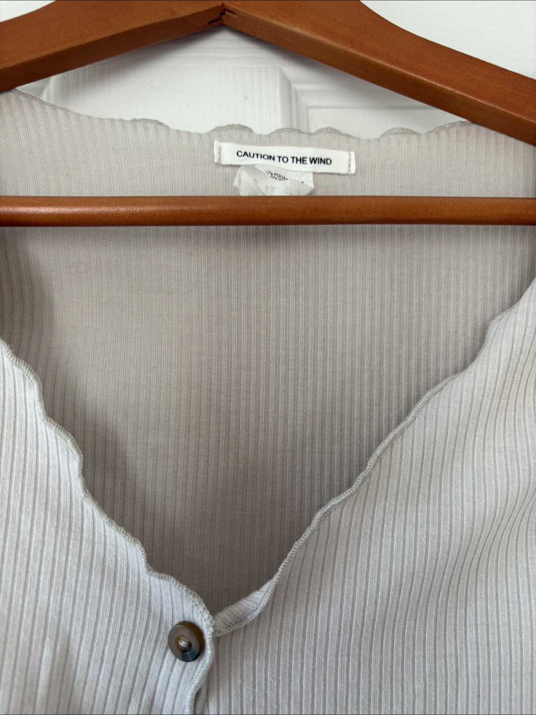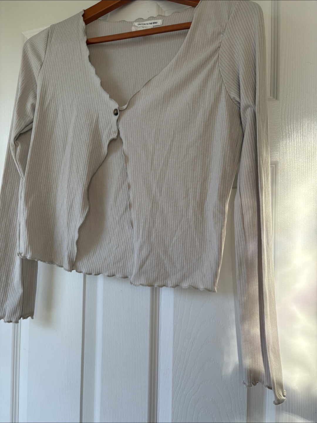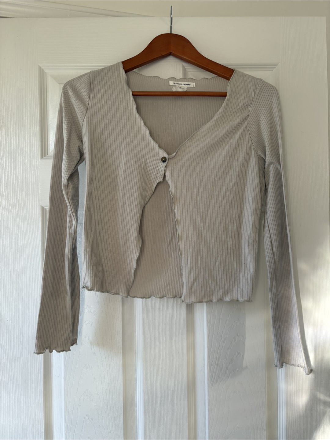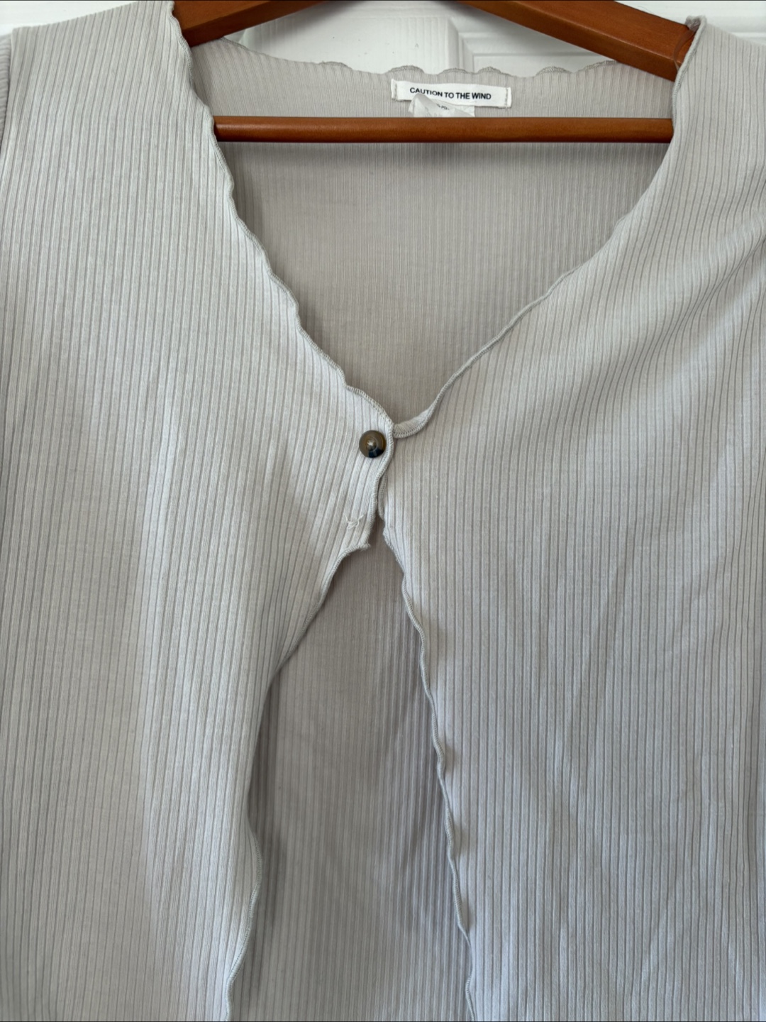Here's a cute cardigan from Caution to the Wind! It's a light grey colour and size small. Perfect for layering or wearing on its own