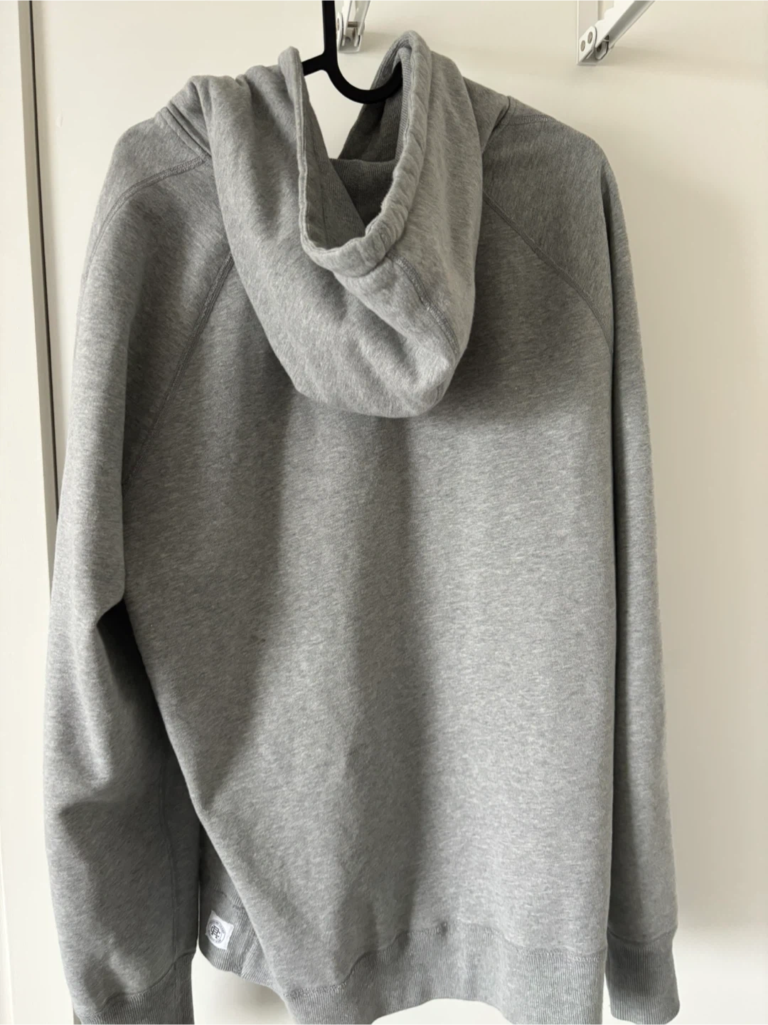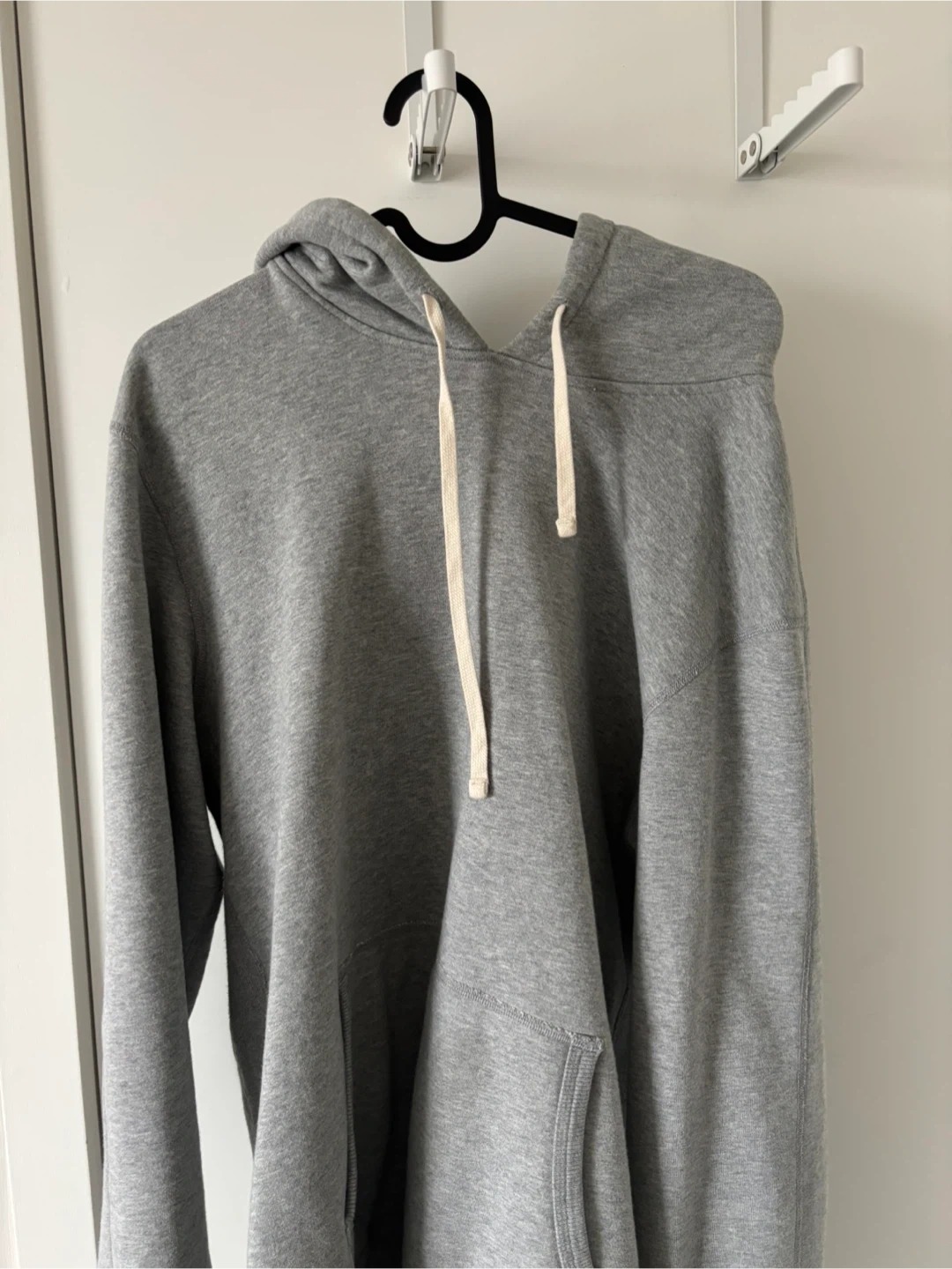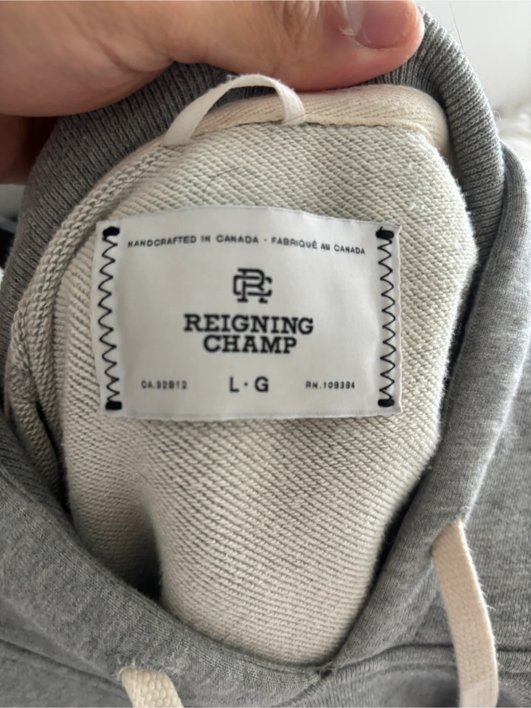 Grey Reigning Champ hoodie, size L. Handcrafted in Canada with a cotton blend. Features a front kangaroo pocket and adjustable drawstring hood.