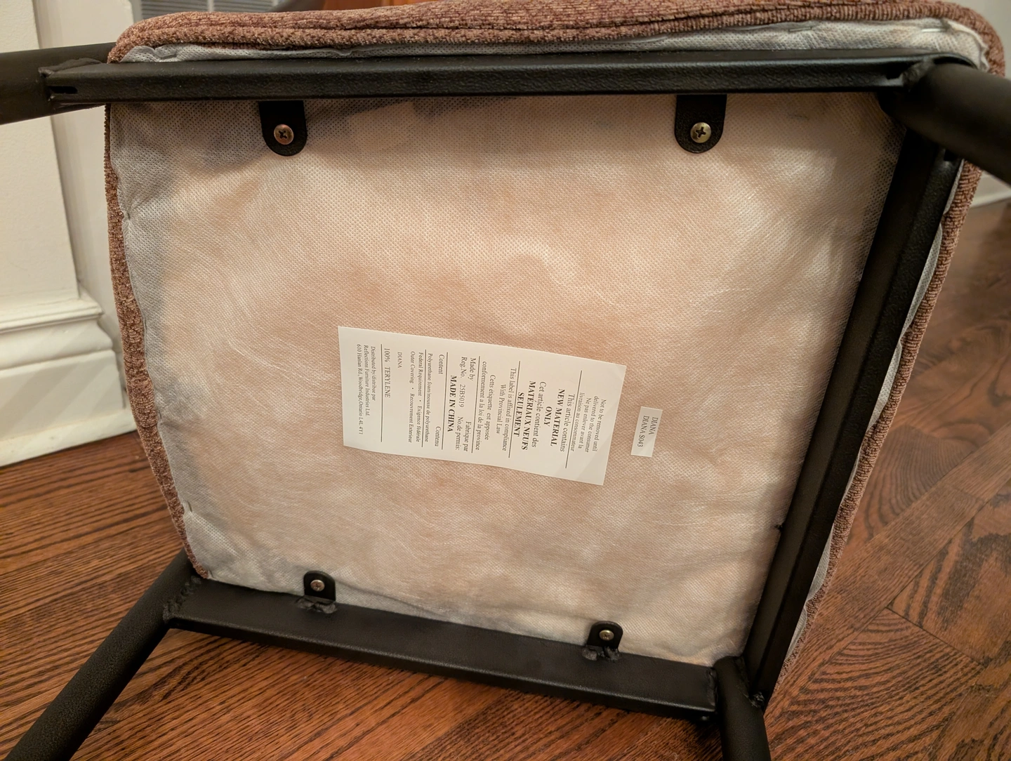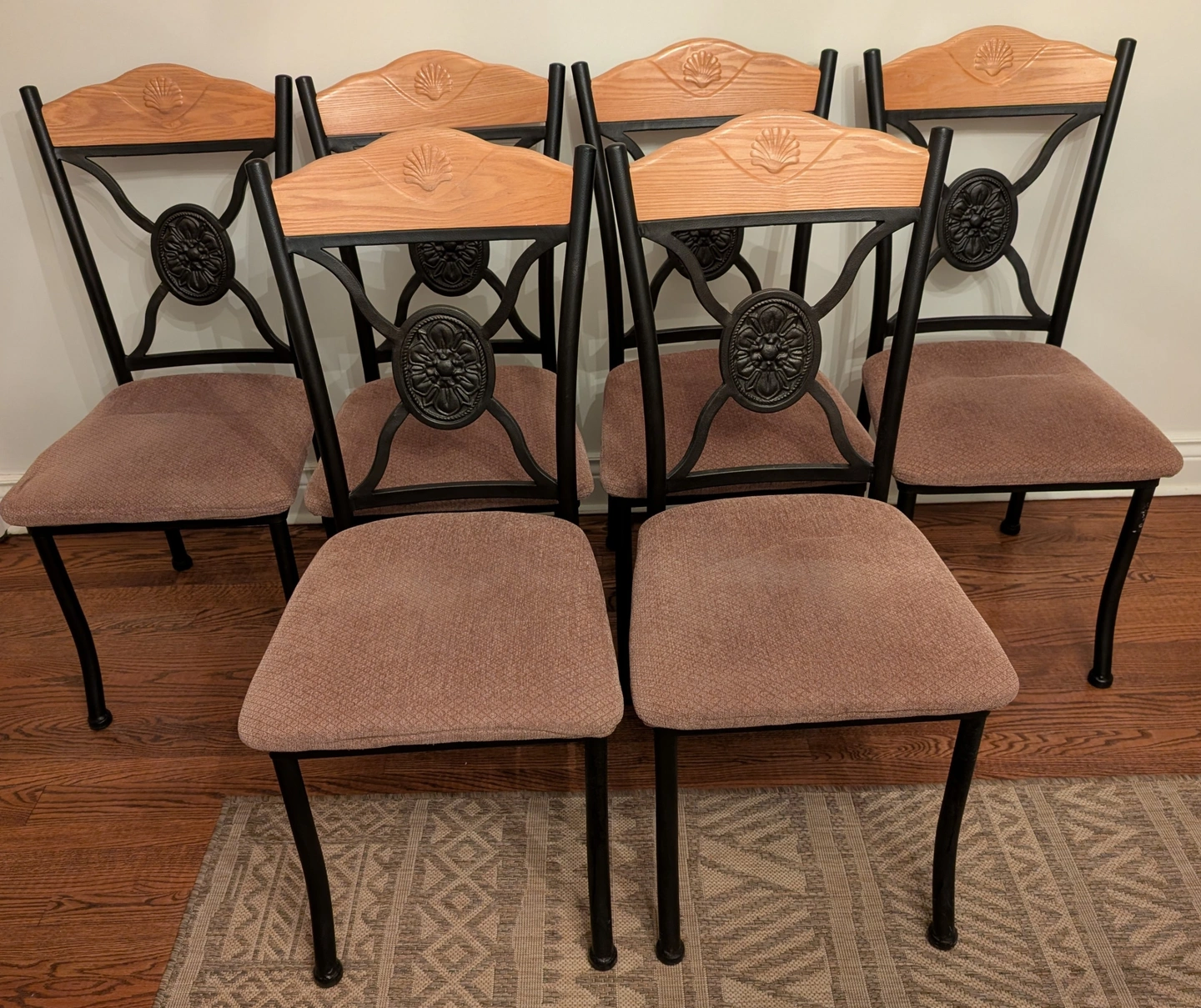$100 for the set of 6 very sturdy, solid, wrought-metal dining chairs with matte black finish, light brown fabric seats, and carved wood insert on top. Seat is 18" wide at front. Chair is 39.5 inches at highest point. Leg bottoms have felt protectors. Some of the wood inserts are scraped along the top, but can be sanded and/or stained/painted to change the look. The seats screw off easily and fabric seat-covers can cover the current fabric. (Easily available online.) Porch pick-up. North of Runnymede/Bloor.