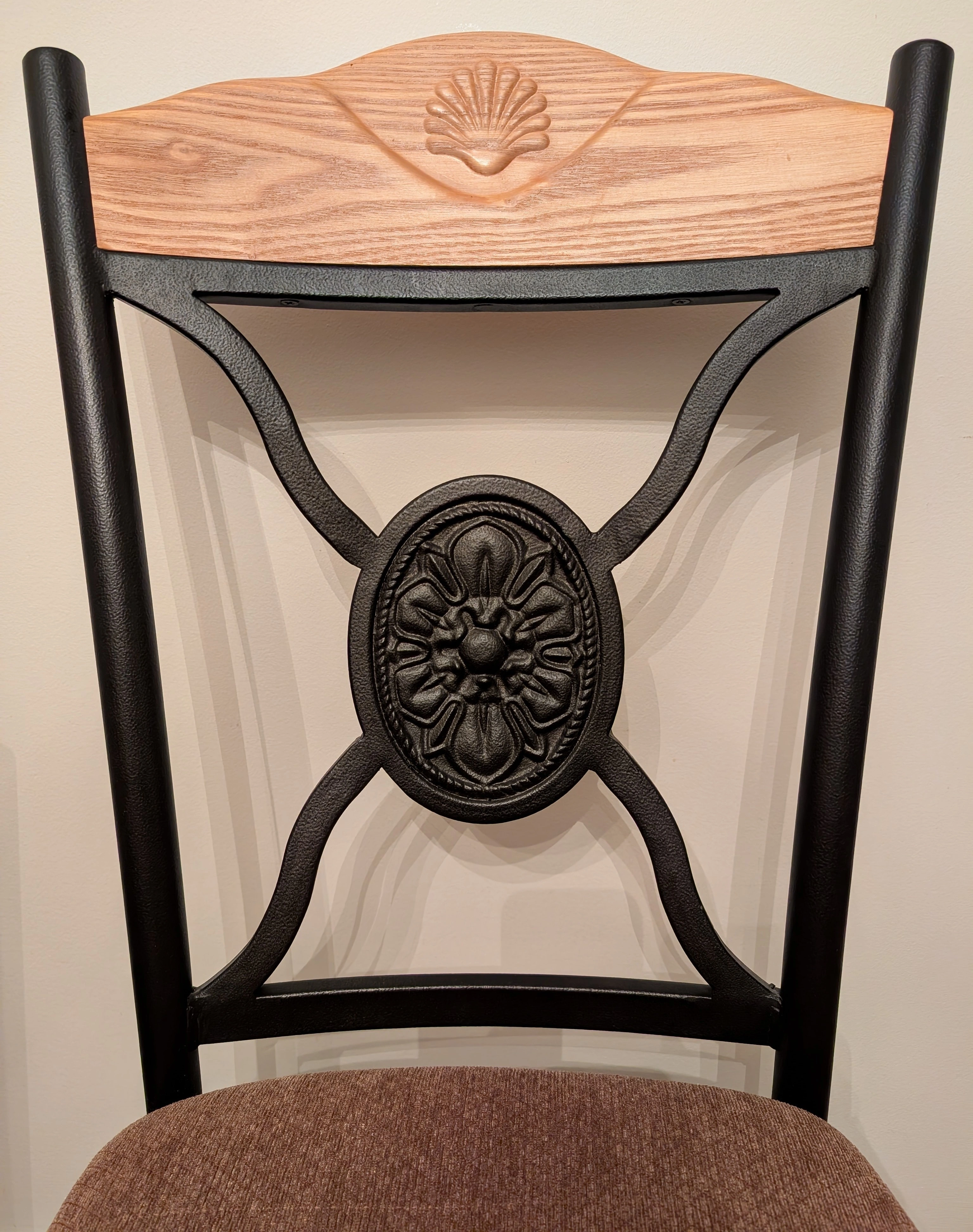 $100 for the set of 6 very sturdy, solid, wrought-metal dining chairs with matte black finish, light brown fabric seats, and carved wood insert on top. Seat is 18" wide at front. Chair is 39.5 inches at highest point. Leg bottoms have felt protectors. Some of the wood inserts are scraped along the top, but can be sanded and/or stained/painted to change the look. The seats screw off easily and fabric seat-covers can cover the current fabric. (Easily available online.) Porch pick-up. North of Runnymede/Bloor.