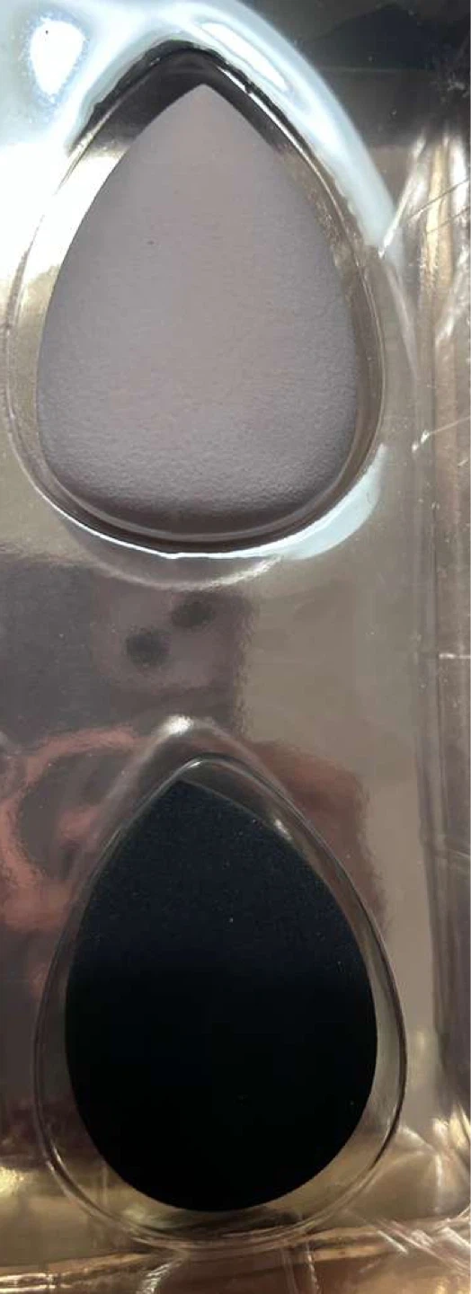Two makeup blending sponges, one black and one white. These are teardrop shaped and come in a plastic package. Great for applying foundation and concealer!