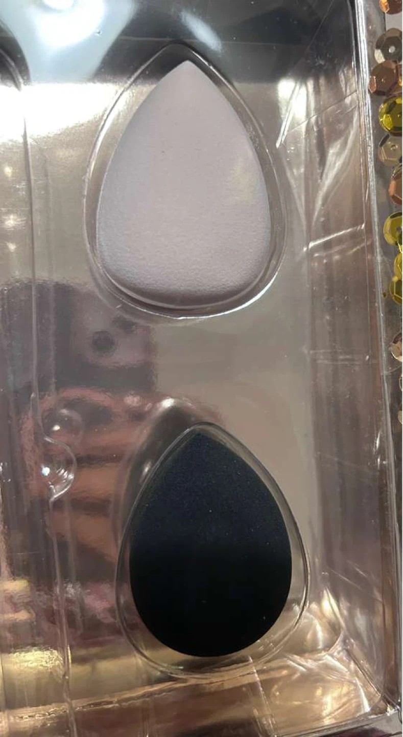 Two makeup blending sponges, one black and one white. These are teardrop shaped and come in a plastic package. Great for applying foundation and concealer!