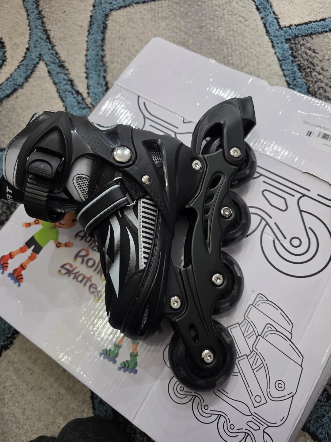 Black adjustable inline skates for kids. These skates are designed for fun and learning to skate. They feature a secure closure system for a snug fit. Excellent for outdoor activities!